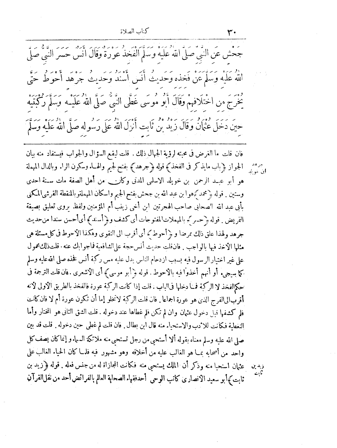جَحْشٍ عَنِ النَّبِىِّ - صلى الله عليه وسلم - «الْفَخِذُ عَوْرَةٌ». وَقَالَ أَنَسٌ حَسَرَ النَّبِىُّ - صلى الله عليه وسلم - عَنْ فَخِذِهِ. وَحَدِيثُ أَنَسٍ أَسْنَدُ وَحَدِيثُ جَرْهَدٍ أَحْوَطُ حَتَّى يُخْرَجَ مِنِ اخْتِلاَفِهِمْ. وَقَالَ أَبُو مُوسَى غَطَّى النَّبِىُّ - صلى الله عليه وسلم - رُكْبَتَيْهِ حِينَ دَخَلَ عُثْمَانُ. وَقَالَ زَيْدُ بْنُ ثَابِتٍ أَنْزَلَ اللَّهُ عَلَى رَسُولِهِ - صلى الله عليه وسلم -