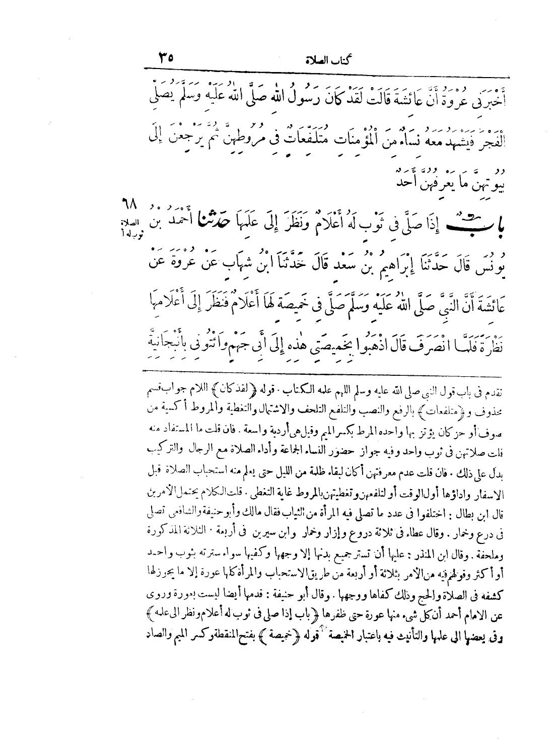 تقدم في باب قول النبي - صلى الله عليه وسلم - علمه الكتاب. قوله (لقد كان) اللام جواب قسم محذوف و (متلفعات) بالرفع والنصب والتلفع التلحف والاشتمال والتغطية والمروط أكسية من سوف أو حز كان يؤثر بها واحدة المرط بكسر الميم وقيل هي أردية واسعة. فإن قلت ما المستفاد منه قلت صلاتهن في ثوب واحد وفيه جواز حضور النساء الجماعة وأداء الصلاة مع الرجال والتركيب يدل على ذلك. فإن قلت عدم معرفتهن أكان لبقاء ظلمة من الليل حتى يعلم منه استحباب الصلاة قبل الأسفار وأداؤها أول الوقت أو لتلفعهن وتغطيتهن بالمروط غاية التغطي. قلت الكلام يحتمل الأمرين قال ابن بطال: اختلفوا في عدد ما تصلي فيه المرأة من الثياب فقال مالك وأبو حنيفة والشافعي تصلي في درع وخمار. وقال عطاء في ثلاثة دروع وإزار وخمار وابن سيرين في أربعة. الثلاثة المذكورة وملحفة. وقال ابن المنذر: عليها أن تستر جميع بدنها إلا وجهها وكفيها سواء سترته بثوب واحد أو أكثر وقولهم فيه من الأمر بثلاثة أو أربعة من طريق الاستحباب والمرأة كلها عورة إلا ما ييجوز لها كشفه في الصلاة والحج وذلك كفاها ووجهها. وقال أبو حنيفة: قدمها أيضاً ليست بعورة وروي عن الإمام أحمد أن كل شئ منها عورة حتى ظفرها. (باب إذا صلى في ثوب له أعلام ونظر إلى علمه) وفي بعضها إلى علمها والتأنيث فيه باعتبار الخميصة. قوله (خميصة) بفتح المنقطة وكسر الميم والصاد