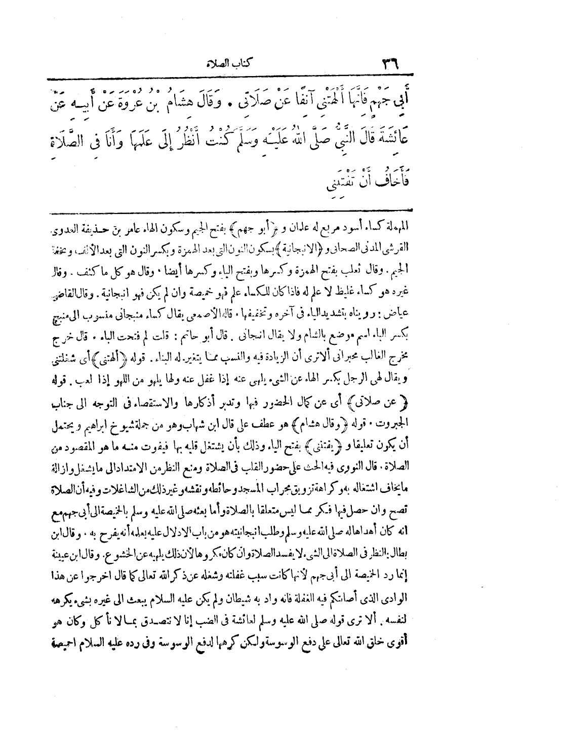 أَبِى جَهْمٍ، فَإِنَّهَا أَلْهَتْنِى آنِفاً عَنْ صَلاَتِى». وَقَالَ هِشَامُ بْنُ عُرْوَةَ عَنْ أَبِيهِ عَنْ عَائِشَةَ قَالَ النَّبِىُّ - صلى الله عليه وسلم - «كُنْتُ أَنْظُرُ إِلَى عَلَمِهَا وَأَنَا فِى الصَّلاَةِ فَأَخَافُ أَنْ تَفْتِنَنِى»