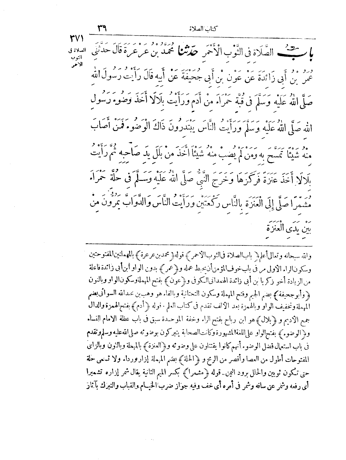 371 - حَدَّثَنَا مُحَمَّدُ بْنُ عَرْعَرَةَ قَالَ حَدَّثَنِى عُمَرُ بْنُ أَبِى زَائِدَةَ عَنْ عَوْنِ بْنِ أَبِى جُحَيْفَةَ عَنْ أَبِيهِ قَالَ رَأَيْتُ رَسُولَ اللَّهِ - صلى الله عليه وسلم - فِى قُبَّةٍ حَمْرَاءَ مِنْ أَدَمٍ، وَرَأَيْتُ بِلاَلاً أَخَذَ وَضُوءَ رَسُولِ اللَّهِ - صلى الله عليه وسلم - وَرَأَيْتُ النَّاسَ يَبْتَدِرُونَ ذَاكَ الْوَضُوءَ، فَمَنْ أَصَابَ مِنْهُ شَيْئاً تَمَسَّحَ بِهِ، وَمَنْ لَمْ يُصِبْ مِنْهُ شَيْئاً أَخَذَ مِنْ بَلَلِ يَدِ صَاحِبِهِ، ثُمَّ رَأَيْتُ بِلاَلاً أَخَذَ عَنَزَةً فَرَكَزَهَا، وَخَرَجَ النَّبِىُّ - صلى الله عليه وسلم - فِى حُلَّةٍ حَمْرَاءَ مُشَمِّرًا، صَلَّى إِلَى الْعَنَزَةِ بِالنَّاسِ رَكْعَتَيْنِ، وَرَأَيْتُ النَّاسَ وَالدَّوَابَّ يَمُرُّونَ مِنْ بَيْنِ يَدَىِ الْعَنَزَةِ