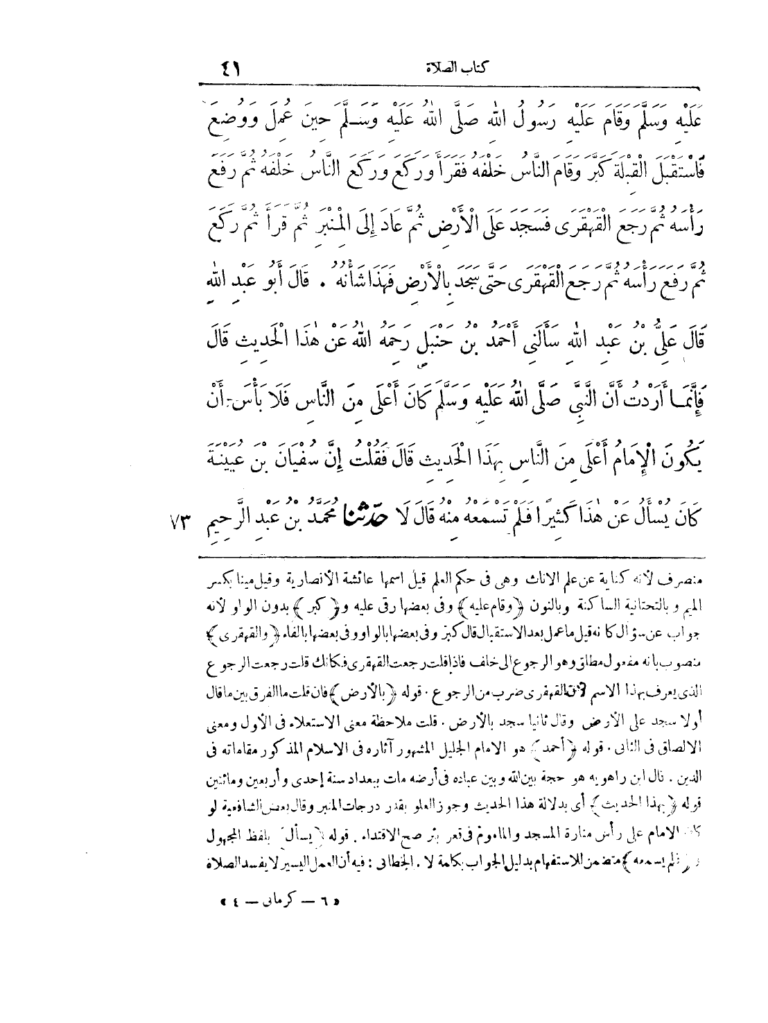 عليه وسلم - وَقَامَ عَلَيْهِ رَسُولُ اللَّهِ - صلى الله عليه وسلم - حِينَ عُمِلَ، وَوُضِعَ، فَاسْتَقْبَلَ الْقِبْلَةَ كَبَّرَ وَقَامَ النَّاسُ خَلْفَهُ، فَقَرَأَ وَرَكَعَ وَرَكَعَ النَّاسُ خَلْفَهُ، ثُمَّ رَفَعَ رَاسَهُ، ثُمَّ رَجَعَ الْقَهْقَرَى، فَسَجَدَ عَلَى الأَرْضِ، ثُمَّ عَادَ إِلَى الْمِنْبَرِ ثُمَّ قَرَأَ ثُمَّ رَكَعَ، ثُمَّ رَفَعَ رَاسَهُ، ثُمَّ رَجَعَ الْقَهْقَرَى حَتَّى سَجَدَ بِالأَرْضِ، فَهَذَا شَانُهُ. قَالَ أَبُو عَبْدِ اللَّهِ قَالَ عَلِىُّ بْنُ عَبْدِ اللَّهِ سَأَلَنِى أَحْمَدُ بْنُ حَنْبَلٍ - رَحِمَهُ اللَّهُ - عَنْ هَذَا الْحَدِيثِ، قَالَ فَإِنَّمَا أَرَدْتُ أَنَّ النَّبِىَّ - صلى الله عليه وسلم - كَانَ أَعْلَى مِنَ النَّاسِ، فَلاَ بَاسَ أَنْ يَكُونَ الإِمَامُ أَعْلَى مِنَ النَّاسِ بِهَذَا الْحَدِيثِ. قَالَ فَقُلْتُ إِنَّ سُفْيَانَ بْنَ عُيَيْنَةَ كَانَ يُسْأَلُ عَنْ هَذَا كَثِيراً فَلَمْ تَسْمَعْهُ مِنْهُ قَالَ لاَ