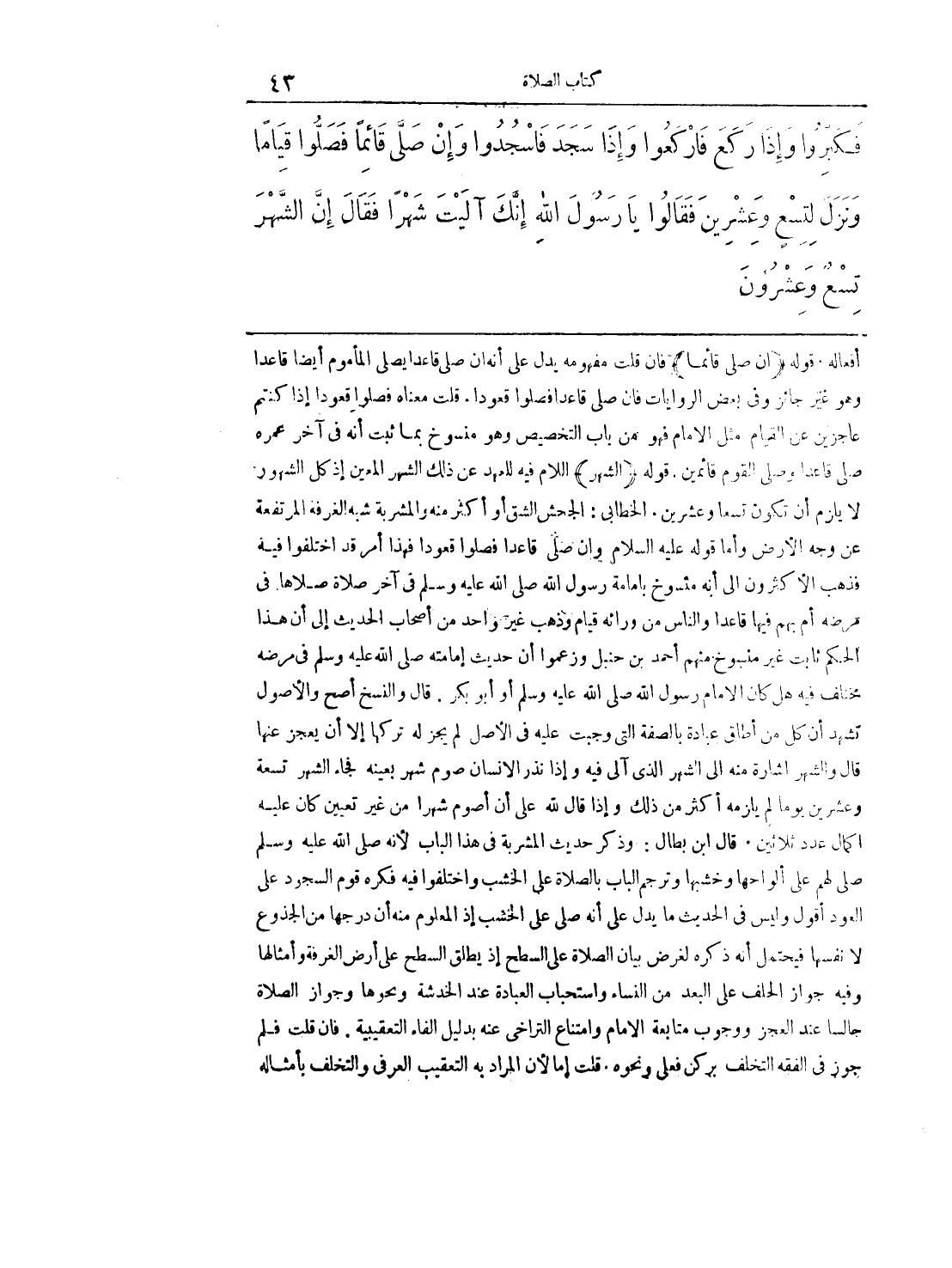 أفعاله. قوله (ان صلى قائما) فان قلت مفهومة يدل على أنه أن صلى قاعدا يصلى المأموم أيضا قاعدا وهو غير جائز وفى بعض الروايات فان صلى قاعدا فصلوا قعودا. قلت معناه فصلوا قعودا اذا كنتم عاجزين عن القيام مثل الأمام فهو من باب التخصيص وهو منسوخ بما ثبت أنه فى آخر عمره صلى قاعدا وصلى القوم قائمين. قوله (الشهر) اللام فيه للعهد عن ذلك الشهر المعين اذ كل الشهور لا يلزم أن تكون تسعا وعشرين. الخطابى: الجحش الشق أو أكثر منه والمشربة شبه الغرفة المرتفعة عن وجه الأرض وأما قوله عليه السلام وان صلى قاعدا فصار قعودا فهذا أمر قد اختلفوا فيه فذهب الأكثرون الى انه منسوخ بامامة رسول الله صلى الله عليه وسلم فى آخر صلاة صلاها فى مرضه أم بهم فيها قاعدا والناس من وراءه قيام وذهب غير واحد من أصحاب الحديث الى أن هذا الحكم ثابت غير منسوخ مهم أحمد بن حنبل وزعموا أن حديث امامته صلى الله عليه وسلم فى مرضه مختلف فيه هل كان الامام رسول الله صلى الله عليه وسلم أو أبو بكر. قال والنسخ أصح والأصول تشهد أن كل من أطلق عبادة بالصفة التى وجبت عليه فى الأصل لم يجز له تركها الا أن يعجز عنها قال والشهر اشارة منه الى الشهر الذى آلى فيه واذا نذر الانسان صوم شهر بعينه فجاء الشهر تسعة وعشرين يوما لم يلزمه أكثر من ذلك واذا قال لله على أن أصوم شهرا من غير تعيين كان عليه اكمال عدد ثلاثين. قال بن بطال: وذكر حديث المشربة فى هذا الباب لانه صلى الله عليه وسلم صلى لهم على ألواحها وخشبها وترجم الباب بالصلاة على الخشب واختلفوا فيه فكرة قوم السجود على العود أقول وليس فى الحديث ما يدل على أنه صلى على الخشب اذ المعلوم منه أن درجها من الجذوع لا نفسها فيحتمل أنه ذكره لغرض بيان الصلاة على السطح اذ يطلق السطح على أرض الغرفة وأمثالها وفيه جواز الحلف على البعد من النساء واستحباب العبادة عند الخدشة ونحوها وجواز الصلاة جالسا عند العجز ووجوب متابعة الأمام وامتناع التراخى عنه بدليل الفاء التعقيبية. فان قلت فلم جوز فى الفقه التخلف بركن فعلى ونحوه. قلت لأن المراد به التعقيب العرفى والتخلف بأمثاله