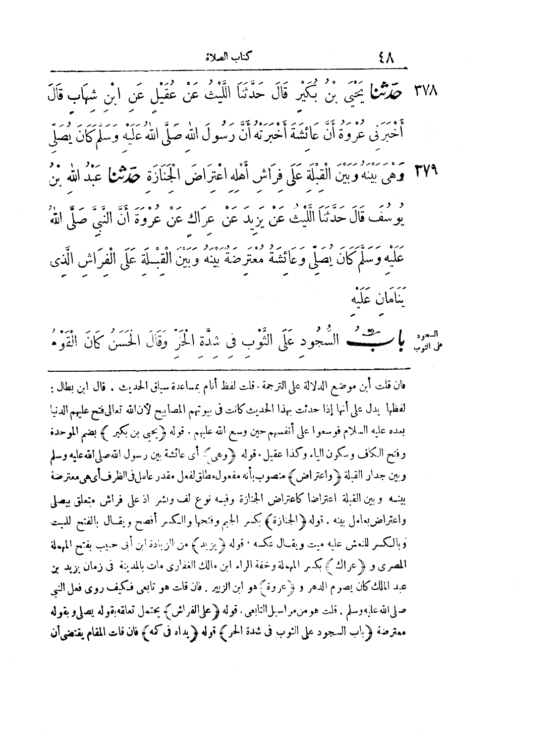 فان قلت اين موضع الدلالة على الترجمة. قلت لفظ أنام بمساعدة سيلقى الحديث. قال ابن بطال: لفظها يدل على انها اذا حدثت بهذا الحديث كانت فى بيوتهم مصابيح لأن الله تعالى فتح عليهم الدنيا بعده عليه السلام فوسعوا على أنفسهم حين وسع الله عليهم. قوله (يحيى بن بكير) بضم الموحدة وفتح الكاف وسكون الياء وكذا عقيل. قوله (وهى) اى عائشة بين رسول الله صلى الله عليه وسلم وبين جدار القبلة (ة اعتراض) منصوب بأنه مفعول مطلق لفعل مقدر عامل فى الظرف أى هى معترضة بينه وبين القبلة اعتراضا كاعتراض الجنازة وفيه نوع لف واذ على فراش متعلق بيصلى واعتراض بعامل بينه. قوله (الجنازة) بكسر الجيم وفتحها والكسر أفصح ويقال بالفتح للبيت وبالكسر للنعش عليه ميت ويقال عكسه. قوله (يزيد) من الزيادة ابن أبى حبيب بفتح المهملة المصرى و (عراك) بكسر المهملة وخفة الراء ابن مالك الغفارى مات بالمدينة فى زمان يزيد بن عبد الملك كان يصوم الدهر و (عروة) هو ابن الزبير. فان قلت هو تابعى فكيف روى فعل النبى صلى الله عليه وسلم. قلت هو من مراسيل التابعى. قوله (على الفراش) يحتمل تعاقه بقوله يصلى وبقوله معترضة (باب السجود على الثوب فى شدة الحر) قوله (يداه فى كمه) فان قلت المقام يقتضى أن