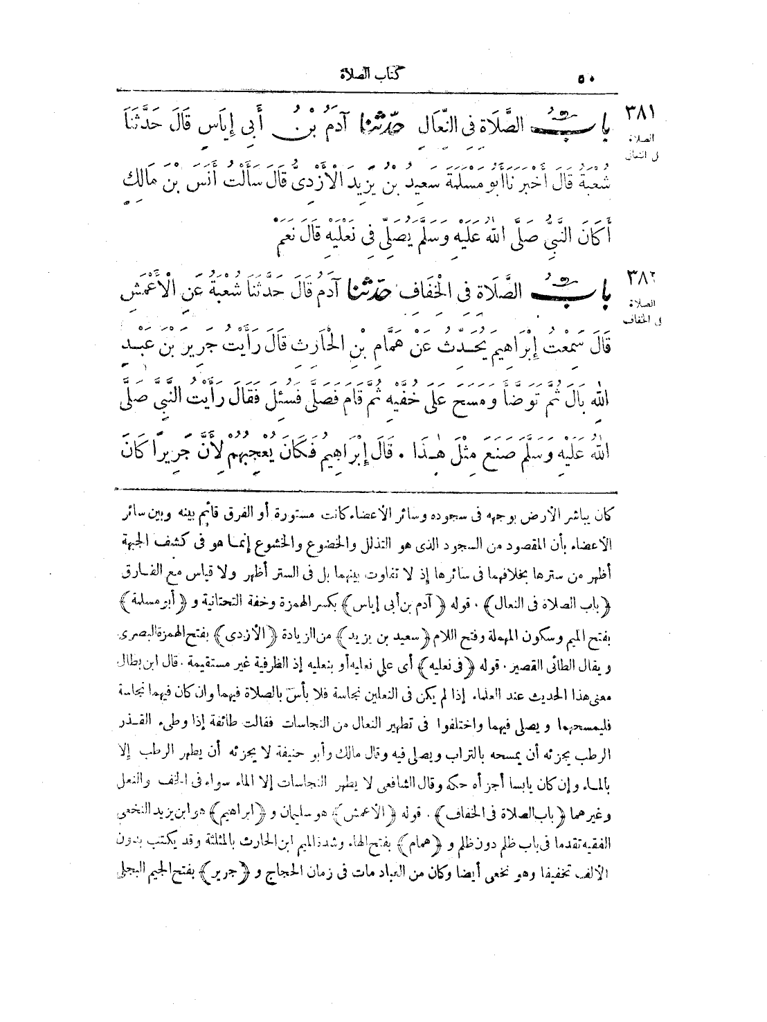 381 - حَدَّثَنَا آدَمُ بْنُ أَبِى إِيَاسٍ قَالَ حَدَّثَنَا شُعْبَةُ قَالَ أَخْبَرَنَا أَبُو مَسْلَمَةَ سَعِيدُ بْنُ يَزِيدَ الأَزْدِىُّ قَالَ سَأَلْتُ أَنَسَ بْنَ مَالِكٍ أَكَانَ النَّبِىُّ - صلى الله عليه وسلم - يُصَلِّى فِى نَعْلَيْهِ قَالَ نَعَمْ