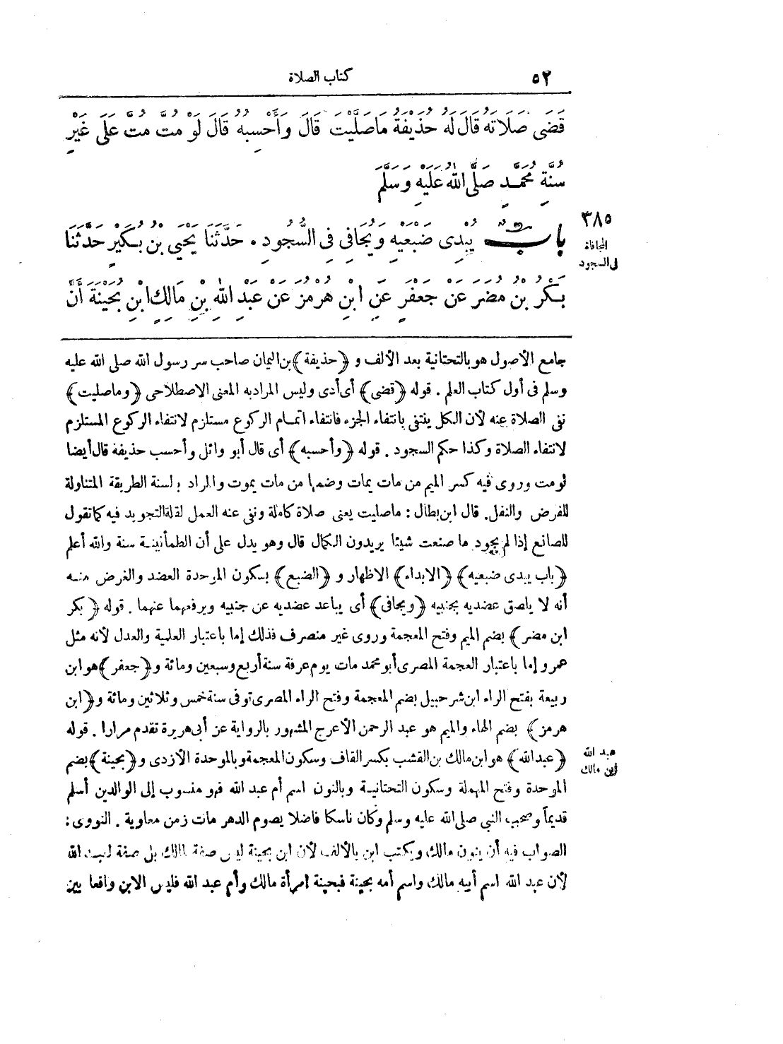 جامع الأصول هو بالتحتانية بعد الألف و (حذيفة) بن اليمان صاحب سر رسول الله صلى الله عليه وسلم فى أول كتاب العلم. قوله (قضى) أى أدى وليس المراد به المعنى الاصطلاحى (وما صليت) نفى الصلاة عنه لأن الكل ينتفى بانتفاء الجزء قانتفاء اتمام الركوع المستلزم لانتفاء الصلاة وكذا حكم السجود. قوله (وأحسبه) أى قال أبو وائل وأحسب حذيفة قال أيضا لو مت وروى فيه كسر الميم من مات يمات وضمها من مات يموت والمراد بالسنة الطريقة المتناولة للفرض والنفل. قال ابن بطال: ما صليت يعنى صلاة كاملة ونفى عنه العمل لقلة التجويد فيه كما تقول للصانع اذا لم يجود ما صنعت شيئا يريدون الكمال قال وهو يدل على أن الطمأنينة سنة والله أعلم (باب يبدى ضبعيه) (الابداء) الاظهار و (الضبع) بسكون الموحدة العضد والغرض منه أنه لا يلصق عضديه بجنبيه (ويجافى) أى يباعد عضديه عن جنبيه ويرفعهما عنهما. قوله (بكر ابن مضر) بضم الميم وفتح المعجمة وروى غير منصرف فذلك اما باعتبار العلمية والعدل لأنه مثل عمرو اما باعتبار العجمة المصرى أبو محمد مات يوم عرفة سنة أربع وسبعين ومائة و (جعفر) هو ابن ربيعة بفتح الراء ابن شرحبيل بضم المعجمة وفتح الراء المصرى توفى سنة خمس وثلاثين ومائة و (ابن هرمز) بضم الهاء والميم هو عبد الرحمن الأعرج المشهور بالرواية عن أبى هريرة تقدم مرارا. قوله (عبد الله) هو ابن مالك بن القشب بكسر القاف وسكون المعجمة وبالموحدة الأزدى و (بحينة) بضم الموحدة وفتح المهملة وسكون التحتانية وبالنون اسم أم عبد الله فهو منسوب الى الوالدين أسلملاقديما وصحب النبى صلى الله عليه وسلم وكان ناسكا فاضلا يصوم الدهر مات زمن معاوية. النووى: الصواب فى أن ينون الملك ويكتب ابن بالألف لأن ابن بحينة ليس صفة لمالك بل صفة لعبد الله لأن عبد الله اسم أبيه مالك واسم أمه بحينة فبحينة امرأة مالك وأم عبد الله فليس الابن واقعا بين