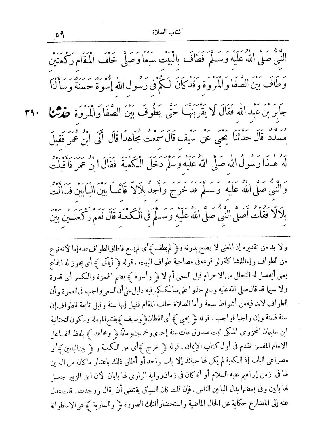 390 - حَدَّثَنَا مُسَدَّدٌ قَالَ حَدَّثَنَا يَحْيَى عَنْ سَيْفٍ قَالَ سَمِعْتُ مُجَاهِداً قَالَ أُتِىَ ابْنُ عُمَرَ فَقِيلَ لَهُ هَذَا رَسُولُ اللَّهِ - صلى الله عليه وسلم - دَخَلَ الْكَعْبَةَ. فَقَالَ ابْنُ عُمَرَ فَأَقْبَلْتُ وَالنَّبِىُّ - صلى الله عليه وسلم - قَدْ خَرَجَ، وَأَجِدُ بِلاَلاً قَائِماً بَيْنَ الْبَابَيْنِ، فَسَأَلْتُ بِلاَلاً فَقُلْتُ أَصَلَّى النَّبِىُّ - صلى الله عليه وسلم - فِى الْكَعْبَةِ قَالَ نَعَمْ رَكْعَتَيْنِ بَيْنَ