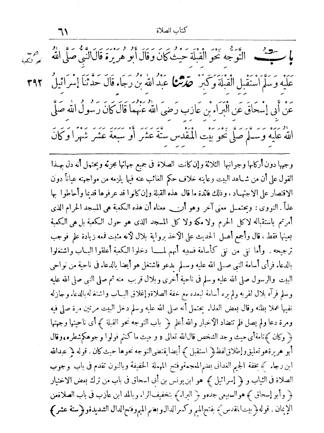 وجهها دون أركانها وجوانبها الثلاثة وإن كانت الصلاة فى جميع جهاتها مجزئة ويحتمل أنه دل بهذا القول على أن من شاهد البيت وعاينه خلاف حكم الغائب عنه فيما يلزمه من مواجهته عيانا دون الاقتصار على الاجتهاد , وذلك فائدة ما قال هذه القبلة وإن كانوا قد عرفوها قديما وأحاطوا بها علما. النووى: ويحتمل معنى آخر وهو أن معناه أن هذه الكعبة هى المسجد الحرام الذى أمرتهم باستقباله لا كل الحرم ولا مكة ولا كل المسجد الذى هو حول الكعبة بل هى الكعبة بعينها فقط. قال وأجمع أهل الحديث على الأخذ برواية بلال لأنه مثبت فمه زيادة علم فوجب ترجيحه. وأما نفى من نفى كأسامة فسببه أنهم لما دخلوا الكعبة أغلقوا الباب واشتغلوا بالدعاء فرأى أسامة النبى صلى الله عليه وسلم يدعو فاشتغل هو أيضا بالدعاء فى ناحية من نواحى البيت والرسول صلى الله عليه وسلم فى ناحية أخرى وبلال قريب منه ثم صلى النبى صلى الله عليه وسلم فرآه بلال لقربه ولم يره أسامة لبعده مع خفة الصلاة وإغلاق الباب واشتغاله بالدعاء وجاز له نفيها عملا بظنه وقال بعض العلماء يحتمل أنه صلى الله عليه وسلم دخل البيت مرتين مرة صلى فيه ومرة دعا ولم يصل فلم تتضاد الأخبار والله أعلم (باب التوجه نحو القبلة) أى ناحيتها وجهتها (وكان) تامة أى حيث وجد الشخص قال اللته تعالى ((وحيث ما كنتم فولوا وجوهكم شطره)) وقال أبو هريرة هو تعليق وإطلاق لفظ (استقبل) أيضا يقتضى التوجه نحوها حيث كان. قوله (عبدالله ابن رجاء) بخفة الجيم الغدائى بضم المعجمة وفتح المهملة الخفيفة وبالنون تقدم فى باب وجوب الصلاة فى الثياب و (اسرائيل) هو ابن يونس بن أبى اسحاق فى باب من ترك بعض الاختيار (وأبو اسحاق) هو السبيعى جده و (البراء) بتخفيف الراء وبالمد ابن عازب فى باب الصلاة من الإيمان. قوله (بيت المقدس) بفتح الميم وكسر الدال وبضم اليم وفتح الدال الشديدة و (ستة عشر)