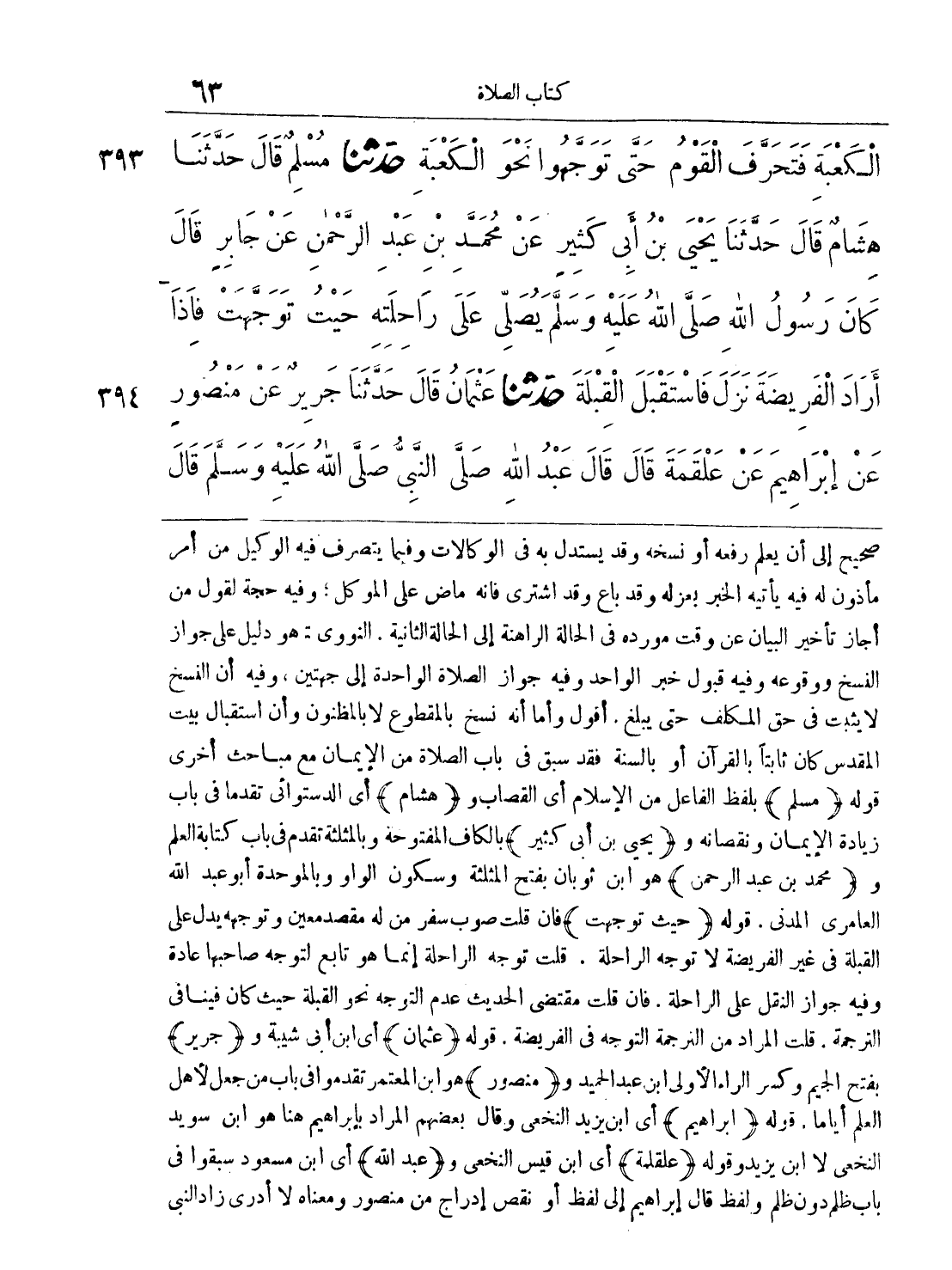 صحيح إلى أن يعلم رفعه أو نسخه وقد يستدل به فى الوكالات وفيما يتصرف فيه الوكيل من أمر مأذون له فيه يأتيه الخبر بعزله وقد باع وقد اشترى فانه ماض على الموكل , وفيه حجة لقول من أجاز تأخير البيان عن وقت مورده فى الحالة الراهنة إلى الحالة الثانية. النورى: هو دليل على جواز النسخ ووقوعه وفيه قبول خبر الواحد وفيه جواز الصلاة الواحدة إلى جهتين , وفيه أن النسخ لا يثبت فى حق المكلف حتى يبلغ. أقول وأما أنه نسخ بالمقطوع لا بالمظنون وأن استقبال بيت المقدس كان ثابتا بالقرآن أو بالسنة فقد سبق فى باب الصلاة من الإيمان مع مباحث أخرى قوله (مسلم) بلفظ الفاعل من الإسلام أى القصاب و (هشام) أى الدستوائى تقدما فى باب زيادة الإيمان ونقصانه و (يحيى بن أبى كثير) بالكاف المفتوحة وبالمثلثة تقدم فى باب كتاب العلم و (محمد بن عبدالرحمن) هو ابن ثوبان بفتح المثلثة وسكون الواو وبالموحدة أبو عبدالله العامرى المدنى. قوله (حيث توجهت) فان قلت صوب سفر من له مقصد معين وتوجهه يدل على القبلة فى غير الفريضة لا توجه الراحلة. قلت توجه الراحلة إنما هو تابع لتوجه صاحبها عادة وفيه جواز النقل على الراحلة. فان قلت مقتضى الحديث عدم التوجه نحو القبلة حيث كان فينا فى الترجمة. قلت المراد من الترجمة التوجه فى الفريضة. قوله (عثمان) أى ابن أبى شيبة و (جرير) بفتح الجيم وكسر الراء الأولى ابن عبدالحميد و (منصور) هو ابن المعتمر تقد وافى باب من جعل لأهل العلم أياما. قوله (ابراهيم) أى ابن يزيد النخعى وقال بعضهم المراد بإبراهيم هنا هو ابن سويد النخعى لا ابن يزيد وقوله (علقلة) أى ابن قيس النخعى و (عبدالله) أى ابن مسعود سبقوا فى باب ظلم دون ظلم ولفظ قال ابراهيم إلى لفظ أو نقص إدراج من منصور ومعناه لا أدرى زاد النبى