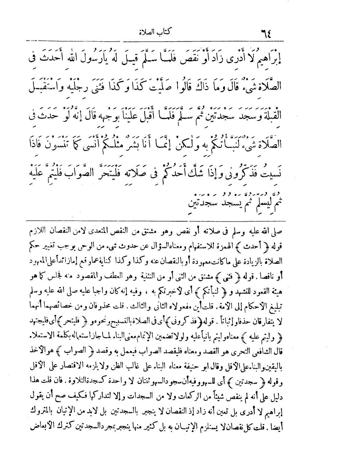 صلى الله عليه وسلم فى صلاته أو نقص وهو مشتق من النقص المتعدى لا من النقصان اللازم قوله (أحدث) الهمزة للاستفهام ومعناه السؤال عن حدوث شئ من الوحى يوجب تغيير حكم الصلاة بزيادة على ما كانت معهودة بالنقصان عنه وكذا وكذا كناية عما وقع إما زائدا على المعهود أو ناقصا. قوله (فثنى) مشتق من الثنى أو من التثنية وهو العطف والمقصود منه فجلس كما هو هيئة القعود للتشهد و (لنبأتكم) أى لا أخبرتكم به , وفيه إنه كان واجبا عليه صلى الله عليه وسلم تبليغ الأحكام الى الأمة. قلت أين مفعولاه الثانى والثالث. قلت محذوفان ومن خصائصهما أنهما لا يتفارقان حذفا واثباتا. قوله (فذكرونى) أى فى الصلاة بالتسبيح ونحوه و (فليتحر) أى فليجتهد (وليتم عليه) معناه وليتم بانيا عليه ولولا تضمين الإتمام معنى البناء لما جاز استعماله بكلمة الاستعلاء قال الشافعى التحرى هو القصد ومعناه فليقصد الصواب فيعمل به وقصد (الصواب) هو الأخذ باليقين والبناء على الأقل وقال أبو حنيفة معناه البناء على غالب الظن ولا يلزمه الاقتصار على الأقل وقوله (سجدتين) أى للسهو وفيه أن سجود السهو ثنتان لا واحدة كسجدة التلاوة. فان قلت هذا دليل على أنه لم ينقص شيئا من الركعات ولا من السجدات وإلا تداركها فكيف صح أن يقول ابراهيم لا أدرى بل تعيين أنه زاد اذ النقصان لا ينجبر بالسجدتين بل لابد من الإتيان بالمتروك أيضا. قلت كل نقصان لا يستلزم الإتيان به بل كثير منها ينجبر بمجرد السجدتين كترك الأبعاض