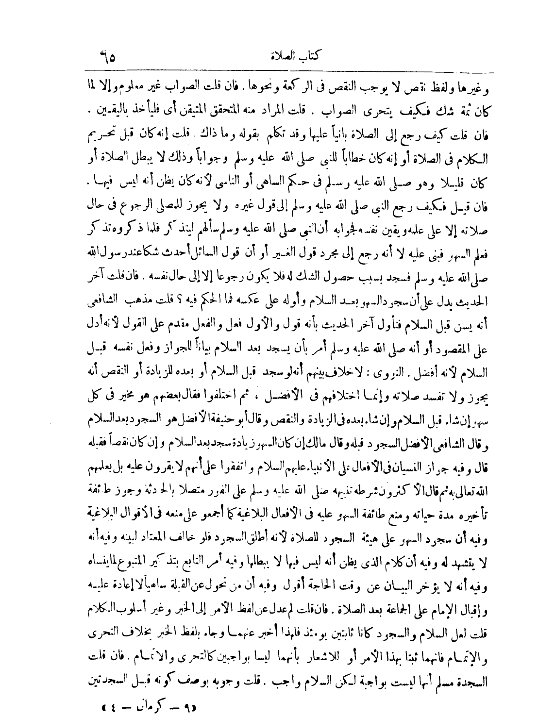 وغيرها ولفظ نقض لا يوجب النقص فى الركعة ونحوها. فان قلت الصواب غير معلوم وإلا لما كان ثمة شك فكيف يتحرى الصواب. قلت المراد المراد منه المتحقق المتيقن أى فليأخذ باليقين. فان قلت كيف رجع الى الصلاة بانيا عليها وقد تكلم بقوله وما ذاك. قلت انه كان قبل تحريم الكلام فى الصلاة أو انه كان خطابا للنبى صلى الله عليه وسلم وجوابا وذلك لا يبطل الصلاة أو كان قليلا وهو صلى الله عليه وسلم فى حكم الساهى أو الناسى لأنه كان يظن أنه ليس فيها. فان قيل فكيف رجع النبى صلى الله عليه وسلم إلى قول غيره ولا يجوز للمصلى الرجوع فى حال صلاته إلا على لمه ويقين نفسه فجوابه أن النبى صلى الله عليه وسلم سألهم ليتذكر فلما ذكر ومتذكر فعلم السهو فبنى عليه لا أنه رجع الى مجرد قول الغير أو أن قول السائل أحدث شكا عند رسول الله صلى الله عليه وسلم فسجد بسبب حصول الشك له فلا يكون رجوعا الا الى حال نفسه. فان قلت فى آخر الحديث يدل على أن سجود السهو بعد السلام وأوله على عكسه فما الحكم فيه؟ قلت مذهب الشافعى أنه يسن قبل السلام فتأول آخر الحديث بأنه قول والأول فعل والفعل مقدم على القول لأنه أدل على المقصود أو أنه صلى الله عليه وسلم أمر بأن يسجد بعد السلام بيانا للجواز وفعل نفسه قبل السلام لأنه أفضل. النووى: لا خلاف بينهم أنه لو سجد قبل السلام أو بعده للزيادة أو النقص أنه يجوز ولا تفسد صلاته وإنما اختلافهم فى الأفضل , ثم اختلفوا فقال بعضهم هو مخير فى كل سهو ان شاء قبل السلام وان شاء بعده فى الزيادة أو النقص وقال أبو حنيفة الأفضل هو السجود بعد السلام وقال الشافعى الأفضل السجود قبله وقال مالك إن كان السهو زيادة سجد بعد السلام وإن كان نقصا فقبله قال وفيه جواز النسيان فى الأفعال على الأنبياء عليهم السلام واتفقوا على أنهم لا يقرون عليه بل بعلمهم الله تعالى ثم قال الأكثرون شرطه تنبيه صلى الله عليه وسلم على الفور متصلا بالحادثة وجوز طائفة تأخيره مدة حياته ومنع طائفة السهو عليه فى الأفعال البلاغية كما أجمعوا على منعه فى الأقوال البلاغية وفيه أن سجود السهو على هيئة السجود للصلاة لأنه أطلق السجود فلو خالف المعتاد لبينه وفيه أنه لا يتشهد له وفيه أن كلام الذى يظن أنه ليس فيها لا يبطلها وفيه أمر التابع بتذكير المتبوع لما ينساه وفيه أنه لا يؤخر البيان عن وقت الحاجة أقول وفيه أن من تحول عن القبلة ساهيا لا إعادة عليه وإقبال الإمام على الجماعة بعد الصلاة. فان قلت لم عدل عن لفظ الأمر الى الخبر وغير أسلوب الكلام قلت لعل السلام والسجود كانا ثابتين يومئذ فلهذا أخبر عنهما وجاء بلفظ الخبر بخلاف التحرى والإتمام فانهما ثبتا بهذا الأمر أو للاشعار بأنهما ليسا بواجبين كالتحرى والإتمام. فان قلت السجدة مسلم أنها ليست بواجبة لكن السلام واجب. قلت وجوبه بوصف كونه قبل السجدتين