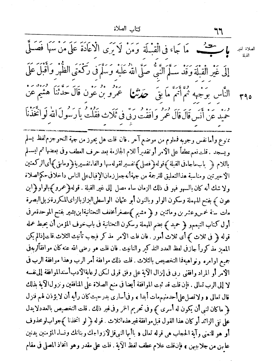 ممنوع وأما نفس وجوبه فمعلوم من موضع آخر. فان قلت هل يجوز من جهة النحو جزم لفظ يسلم ويسجد. قلت نعم عطفا على الأمر أو تقديرا للام الجازمة بعد حرف العطف وفى بعضها ثم ليسلم باللام (باب ما جاء فى القبلة) قوله (فصلى) تفسير لقوله سها والفاء تفسيرية (وما بقى) أى الركعتين الأخيرتين ومناسبة هذا التعليق للترجمة من جهة أنه جعل زمان الإقبال على الناس داخلا فى حكم الصلاة ولا شك أنه كان بالسهو فهو فى ذلك الزمان ساه مصل إلى غير القبلة. قوله (عمرو) بالواو (ابن عون) بفتح المهملة وسكون الواو وبالنون أبو عثمان الواسطى البزاز بالزاى المكررة نزيل البصرة مات سنة خمس وعشرين ومائتين و (هشيم) مصغرا مخفف التحتانية ابن بشير بفتح الموحدة مر فى أول كتاب التيمم و (حميد) بضم المهملة وسكون التحتانية فى باب خوف المؤمن أن يحبط عمله قوله (فى ثلاث) أى ثلاث أمور. فان قلت هو رضى الله عنه كان موافقا لربه فى جميع أوامره ونواهيه فما التخصيص بالثلاث. قلت ذلك موافقة أمر الرب وهذا موافقة الرب فى الأمر أو المراد وافقنى ربى فى إنزال الآية على وفق قولى لكن لرعاية الأدب أسند الموافقة إلى نفسه لا الى الرب تعالى , فان قلت قد ثبت الموافقة أيضا فى منع الصلاة على المنافقين ونزول الآية بذلك قال تعالى ((ولا تصل على أحد منهم مات أبدا)) وفى أسارى بدر حيث كان رأيه أن لا يؤذن لهم فنزل (ما كان لنبى أن يكون له أسرى) وفى تحريم الخمر وفى غير ذلك. قلت التخصيص بالعدد لا يدل على نفى الزائد أو كان هذا القول قبل موافقة غير هذه الثلاث. قوله (لو اتخذنا) جواب لو محذوف أو هو للتمنى وآية الحجاب هى قوله تعالى ((يا أيها النبى قل لأزواجك وبناتك ونساء المؤمنين يدنين عليهن من جلابيبهن)) فان قلت علام عطف لفظ الآية. قلت على مقدر وهو اتخاذ المصلى فى مقام