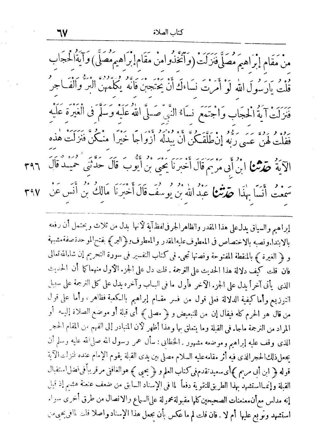 مِنْ مَقَامِ إِبْرَاهِيمَ مُصَلًّى فَنَزَلَتْ (وَاتَّخِذُوا مِنْ مَقَامِ إِبْرَاهِيمَ مُصَلًّى) وَآيَةُ الْحِجَابِ قُلْتُ يَا رَسُولَ اللَّهِ لَوْ أَمَرْتَ نِسَاءَكَ أَنْ يَحْتَجِبْنَ، فَإِنَّهُ يُكَلِّمُهُنَّ الْبَرُّ وَالْفَاجِرُ. فَنَزَلَتْ آيَةُ الْحِجَابِ، وَاجْتَمَعَ نِسَاءُ النَّبِىِّ - صلى الله عليه وسلم - فِى الْغَيْرَةِ عَلَيْهِ فَقُلْتُ لَهُنَّ عَسَى رَبُّهُ إِنْ طَلَّقَكُنَّ أَنْ يُبَدِّلَهُ أَزْوَاجاً خَيْراً مِنْكُنَّ. فَنَزَلَتْ هَذِهِ الآيَةُ.