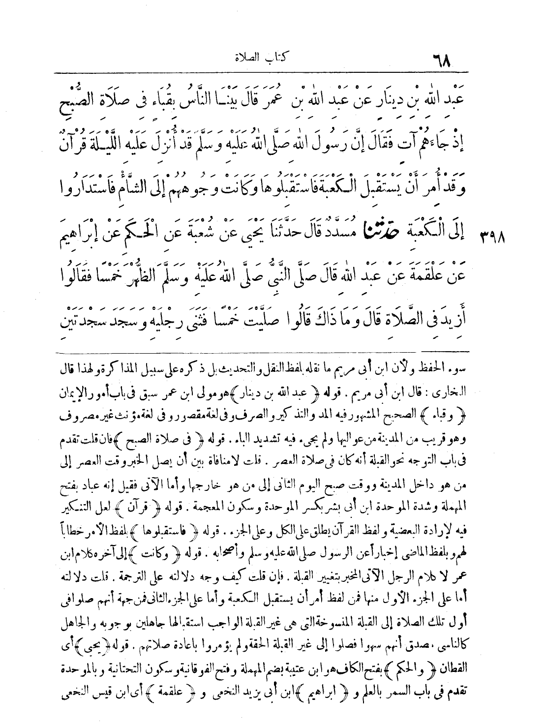عَبْدِ اللَّهِ بْنِ دِينَارٍ عَنْ عَبْدِ اللَّهِ بْنِ عُمَرَ قَالَ بَيْنَا النَّاسُ بِقُبَاءٍ فِى صَلاَةِ الصُّبْحِ إِذْ جَاءَهُمْ آتٍ فَقَالَ إِنَّ رَسُولَ اللَّهِ - صلى الله عليه وسلم - قَدْ أُنْزِلَ عَلَيْهِ اللَّيْلَةَ قُرْآنٌ، وَقَدْ أُمِرَ أَنْ يَسْتَقْبِلَ الْكَعْبَةَ فَاسْتَقْبِلُوهَا، وَكَانَتْ وُجُوهُهُمْ إِلَى الشَّامِ، فَاسْتَدَارُوا إِلَى الْكَعْبَةِ