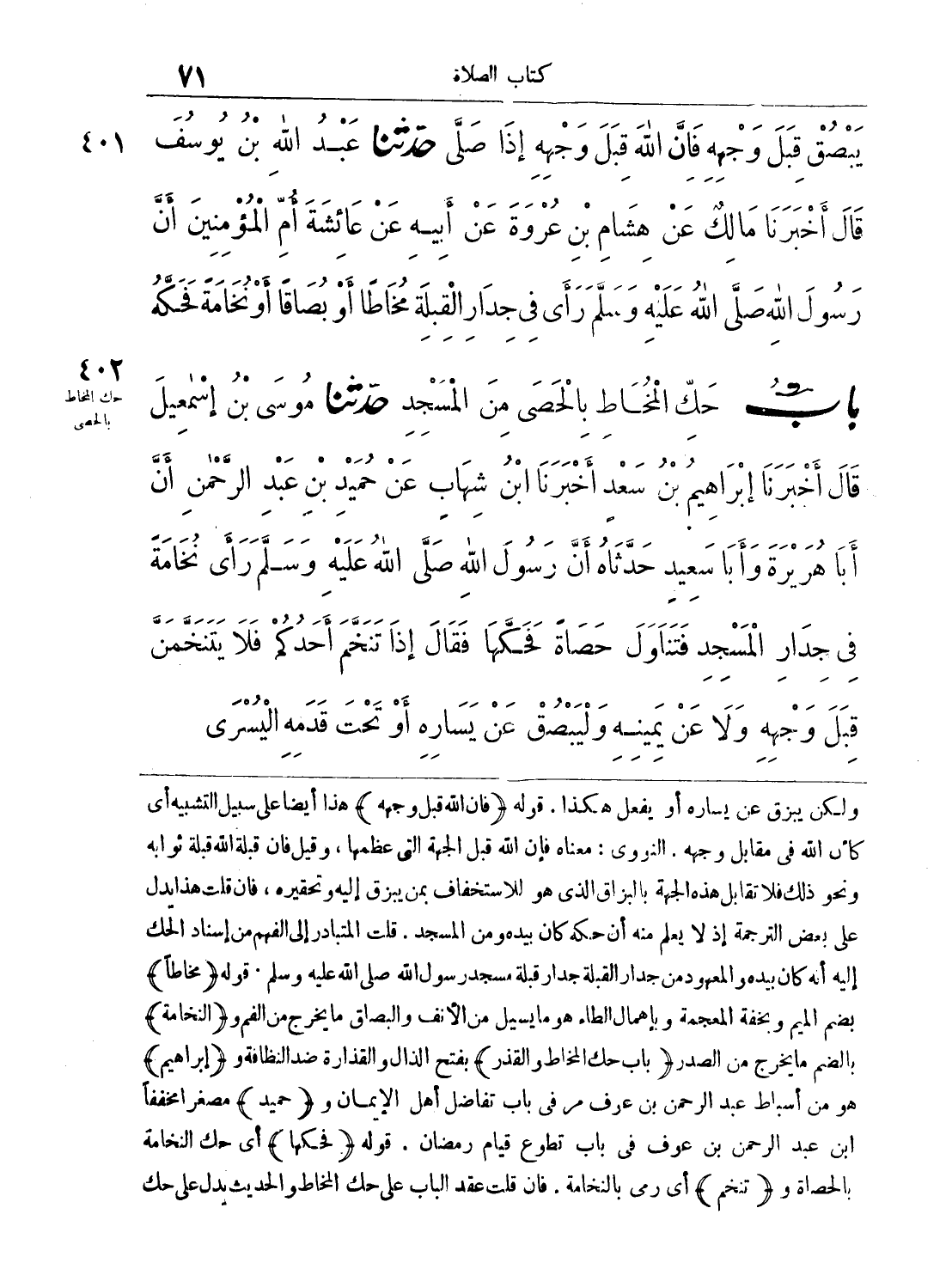 402 - حَدَّثَنَا مُوسَى بْنُ إِسْمَاعِيلَ قَالَ أَخْبَرَنَا إِبْرَاهِيمُ بْنُ سَعْدٍ أَخْبَرَنَا ابْنُ شِهَابٍ عَنْ حُمَيْدِ بْنِ عَبْدِ الرَّحْمَنِ أَنَّ أَبَا هُرَيْرَةَ وَأَبَا سَعِيدٍ حَدَّثَاهُ أَنَّ رَسُولَ اللَّهِ - صلى الله عليه وسلم - رَأَى نُخَامَةً فِى جِدَارِ الْمَسْجِدِ، فَتَنَاوَلَ حَصَاةً فَحَكَّهَا فَقَالَ «إِذَا تَنَخَّمَ أَحَدُكُمْ فَلاَ يَتَنَخَّمَنَّ قِبَلَ وَجْهِهِ وَلاَ عَنْ يَمِينِهِ، وَلْيَبْصُقْ عَنْ يَسَارِهِ أَوْ تَحْتَ قَدَمِهِ اليُسْرَى»