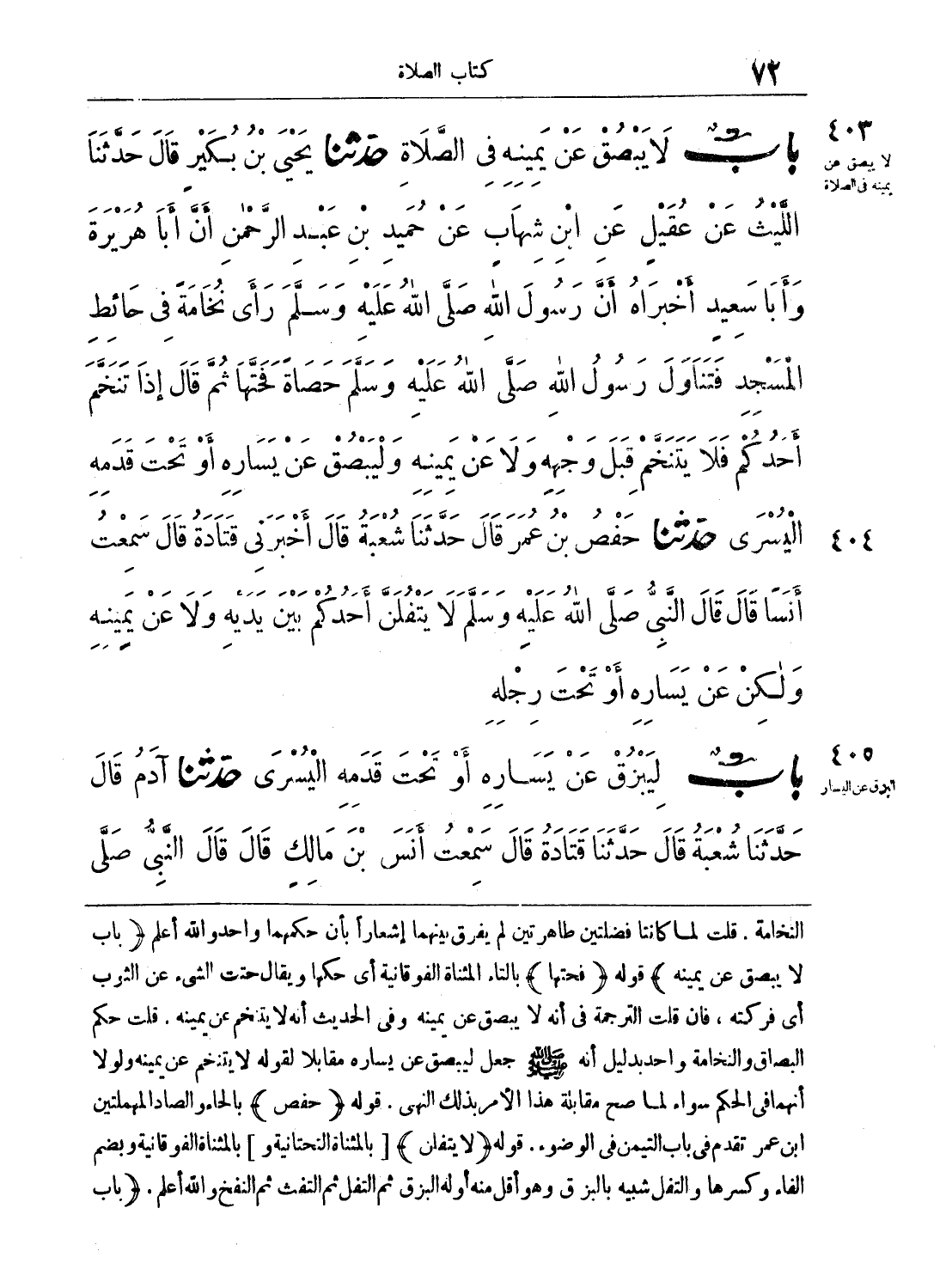 404 - حَدَّثَنَا حَفْصُ بْنُ عُمَرَ قَالَ حَدَّثَنَا شُعْبَةُ قَالَ أَخْبَرَنِى قَتَادَةُ قَالَ سَمِعْتُ أَنَساً قَالَ قَالَ النَّبِىُّ - صلى الله عليه وسلم - «لاَ يَتْفِلَنَّ أَحَدُكُمْ بَيْنَ يَدَيْهِ وَلاَ عَنْ يَمِينِهِ، وَلَكِنْ عَنْ يَسَارِهِ أَوْ تَحْتَ رِجْلِهِ»