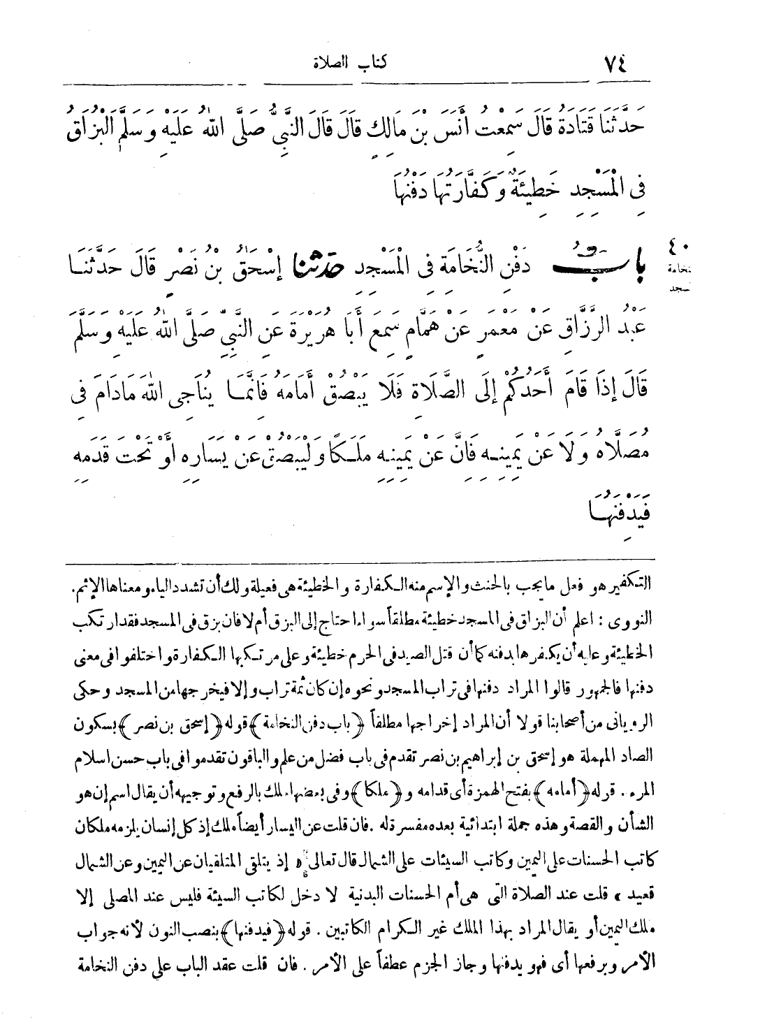 التكفير هو فعل ما يجب بالحنث والاسم منه الكفارة والخطيئة هي فعيلة ولك أن تشدد الياء ومعناها الإثم، النووي: اعلم أن البزاق في المسجد فقد ارتكب الخطيئة وعليه أن يكفرها بدفنه كما أن قتل الصيد في الحرم خطيئة وعلى مرتكبها الكفارة واختلفوا في معنى دفنها فالجمهور قالوا المراد دفنها في تراب المسجد ونحوه إن كان ثمة تراب وإلا فيخرجها من المسجد وحكى الروباني من أصحابنا قولاً أن المراد إخراجها مطلقاً (باب دفن النخامة) قوله (إسحق بن نصر) بسكون الصاد المهملة هو إسحق بن إبراهيم بن نصر تقدم في باب فضل من علم والباقون تقدموا في باب حسن إسلام المرء. قوله (أمامه) بفتح الهمزة أي قدامه و (ملكاً) وفي بعضها ملك بالرفع وتوجيهه أن يقال اسم إن هو الشأن والقصة وهذه جملة ابتدائية بعده مفسرة له. فإن قلت عن اليسار أيضاً ملك إذ كل إنسان يلزمه ملكان كاتب الحسنات على اليمين وكاتب السيئات على الشمال قال تعالى: (إذ يتلقى المتلقيان عن اليمين وعن الشمال قعيد) قلت عند الصلاة التي هي أم الحسنات البدنية لا دخل لكاتب السيئة فليس عند المصلى إلا ملك اليمين أو يقال المراد بهذا الملك غير الكرام الكاتبين. قوله (فيدفنها) بنصب النون لأنه جواب الأمر وبرفعها أي فهو يدفنها وجاز الجزم عطفاً على الأمر، فإن قلت عقد الباب على دفن النخامة