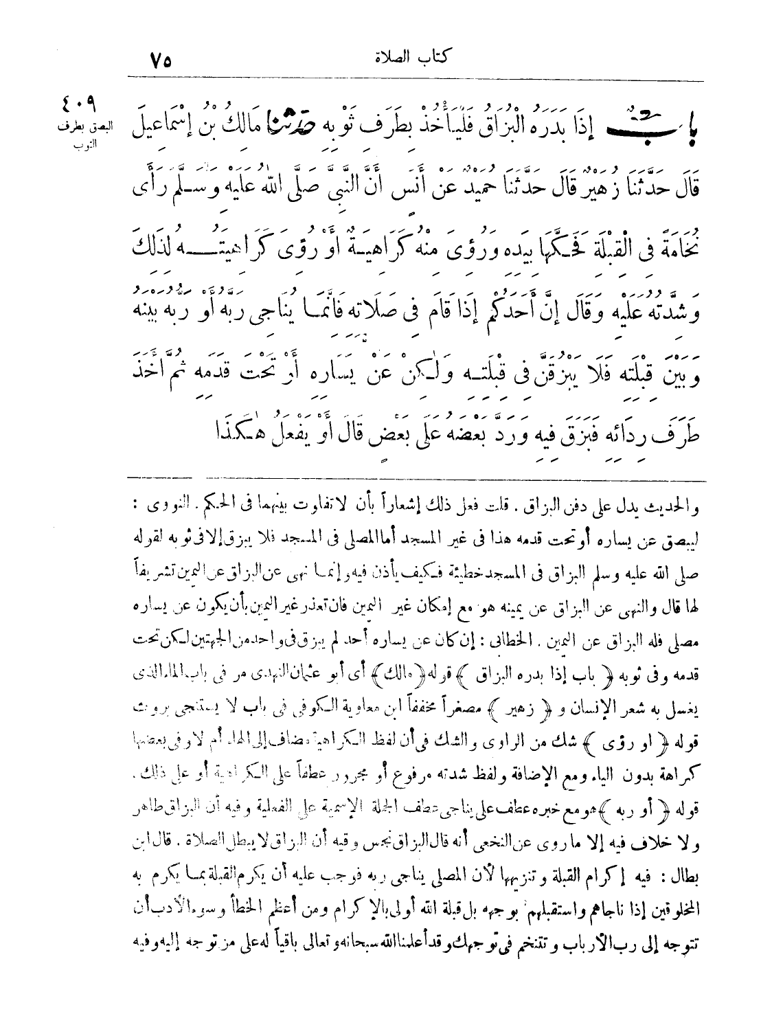 409 - حَدَّثَنَا مَالِكُ بْنُ إِسْمَاعِيلَ قَالَ حَدَّثَنَا زُهَيْرٌ قَالَ حَدَّثَنَا حُمَيْدٌ عَنْ أَنَسٍ أَنَّ النَّبِىَّ - صلى الله عليه وسلم - رَأَى نُخَامَةً فِى الْقِبْلَةِ فَحَكَّهَا بِيَدِهِ، وَرُئِىَ مِنْهُ كَرَاهِيَةٌ - أَوْ رُئِىَ كَرَاهِيَتُهُ لِذَلِكَ وَشِدَّتُهُ عَلَيْهِ - وَقَالَ «إِنَّ أَحَدَكُمْ إِذَا قَامَ فِى صَلاَتِهِ فَإِنَّمَا يُنَاجِى رَبَّهُ - أَوْ رَبُّهُ بَيْنَهُ وَبَيْنَ قِبْلَتِهِ - فَلاَ يَبْزُقَنَّ فِى قِبْلَتِهِ، وَلَكِنْ عَنْ يَسَارِهِ أَوْ تَحْتَ قَدَمِهِ». ثُمَّ أَخَذَ طَرَفَ رِدَائِهِ فَبَزَقَ فِيهِ، وَرَدَّ بَعْضَهُ عَلَى بَعْضٍ، قَالَ «أَوْ يَفْعَلُ هَكَذَا»
