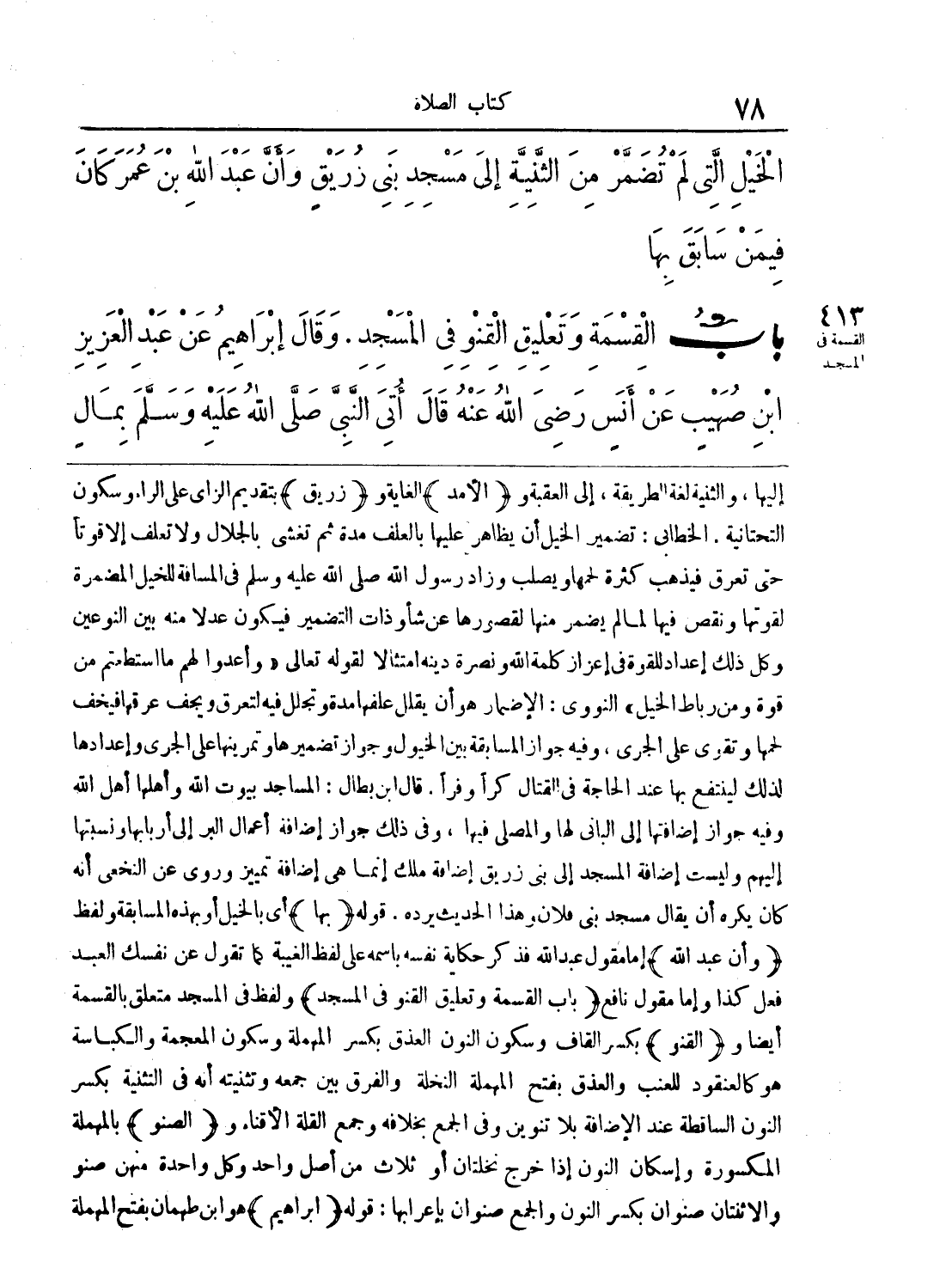 إليها، والثنية لغة الطريقة، إلى العقبة و (الأمد) الغاية و (زريق) بتقديم الزاي على الراء وسكون التحتانية. الخطابي: تضمير الخيل أن يظاهر عليها بالعلف مدة ثم تغشى بالجلال ولا تعلف إلا قوتاً حتى تعرق فيذهب كثرة لحمها ويصلب وزاد رسول الله - صلى الله عليه وسلم - في المسافة للخيل المضمرة لقوتها ونقص فيها لما لم يضمر منها لقصورها عن شأو ذات التضمير فيكون عدلاً منه بين النوعين وكل ذلك إعداد للقوة في إعزاز كلمة الله ونصرة دينه امتثالاً لقوله تعالى (وأعدوا لهم ما استطعتم من قوة ومن رباط الخيل) النووي: الإضمار هو أن يقلل علفها مدة وتجلل فيه لتعرق ويجف عرقها فيخف لحمها وتقوى على الجري، وفيه جواز المسابقة بين الخيول وجواز تضميرها وتمرينها على الجري وإعدادها لذلك لينتفع بها عند الحاجة في القتال كراً وفراً. قال ابن بطال: المساجد بيوت الله وأهلها أهل الله وفيه جواز إضافتها إلى الباني لها والمصلي فيها، وفي ذلك جواز إضافة أعمال البر إلى أربابها ونسبتها إليهم وليست إضافة المسجد إلى بني زريق إضافة ملك إنما هي إضافة تمييز وروي عن النخعي أنه كان يكره أن يقال مسجد بني فلان وهذا الحديث يرده. قوله (بها) أي بالخيل أو بهذه المسابقة ولفظ (وأن عبد الله) إما مقول عبد الله فذكر حكاية نفسه باسمه على لفظ الغيبة كما تقول عن نفسك العبد فعل كذا وإما مقول نافع (باب القسمة وتعليق القنو في المسجد) ولفظ في المسجد متعلق بالقسمة أيضاً و (القنو) بكسر القاف وسكون النون المذق بكسر المهملة وسكون المعجمة والكباسة هو كالعنقود للعنب والعذق بفتح المهملة النخلة والفرق بين جمعه وتثنيته أنه في التثنية بكسر النون الساقطة عند الإضافة بلا تنوين وفي الجمع بخلافه وجمع القلة الأقناء و (العسنو) بالمهملة المكسورة وإسكان النون إذ خرج نخلتان أو ثلاث من أصل واحد وكل واحدة منهن صنو والاثنتان صنوان بكسر النون والجمع صنوان بإعرابها: قوله (إبراهيم) هو ابن طهمان بفتح المهملة