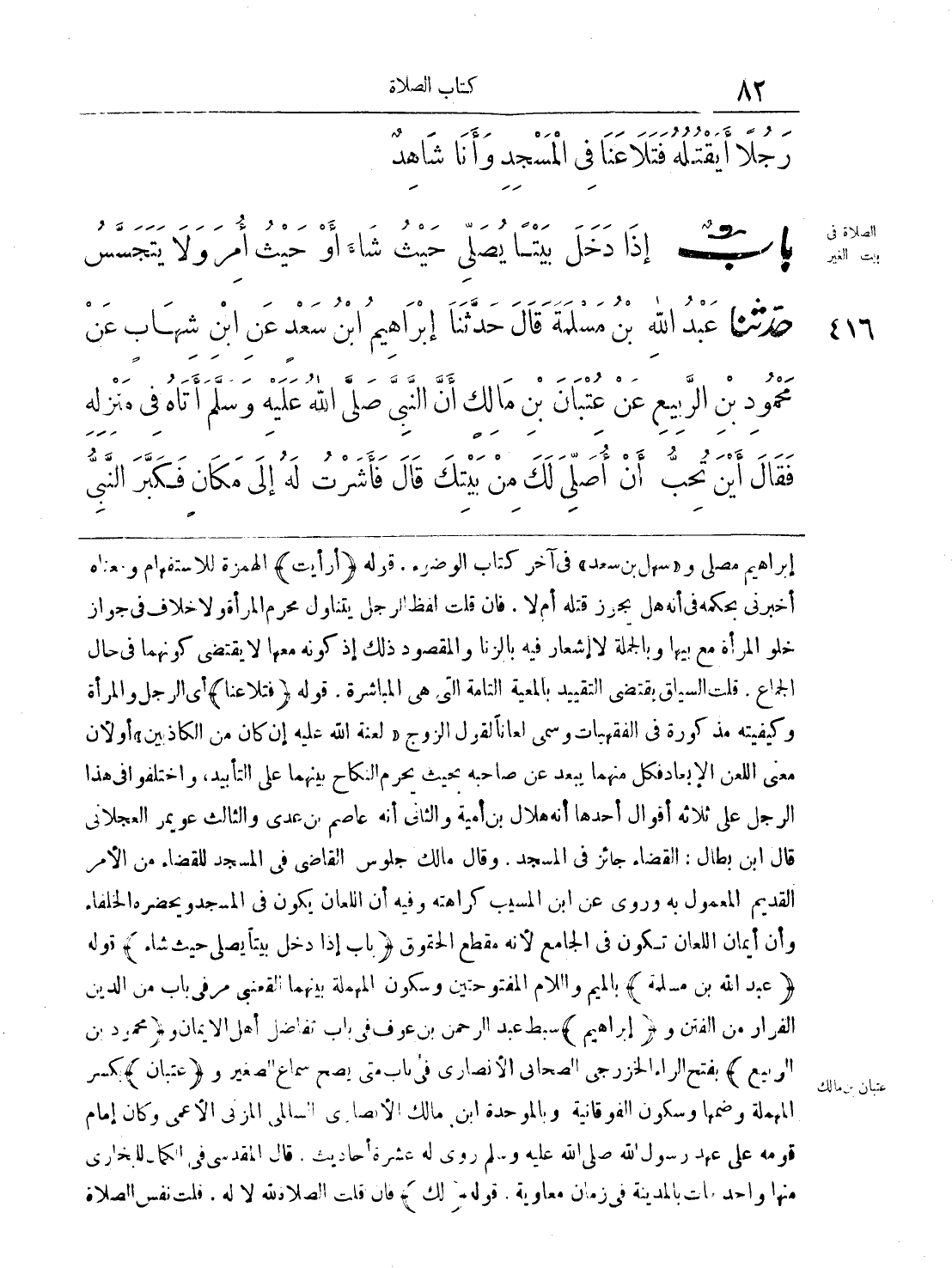 416 - حَدَّثَنَا عَبْدُ اللَّهِ بْنُ مَسْلَمَةَ قَالَ حَدَّثَنَا إِبْرَاهِيمُ بْنُ سَعْدٍ عَنِ ابْنِ شِهَابٍ عَنْ مَحْمُودِ بْنِ الرَّبِيعِ عَنْ عِتْبَانَ بْنِ مَالِكٍ أَنَّ النَّبِىَّ - صلى الله عليه وسلم - أَتَاهُ فِى مَنْزِلِهِ فَقَالَ «أَيْنَ تُحِبُّ أَنْ أُصَلِّىَ لَكَ مِنْ بَيْتِكَ». قَالَ فَأَشَرْتُ لَهُ إِلَى مَكَانٍ، فَكَبَّرَ النَّبِىُّ