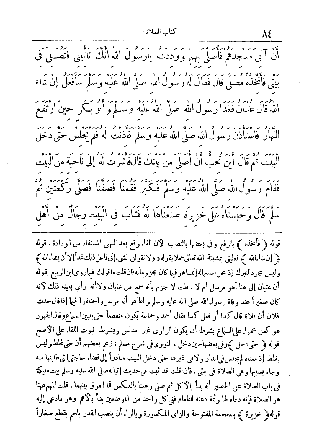 أَنْ آتِىَ مَسْجِدَهُمْ فَأُصَلِّىَ بِهِمْ، وَوَدِدْتُ يَا رَسُولَ اللَّهِ أَنَّكَ تَاتِينِى فَتُصَلِّىَ فِى بَيْتِى، فَأَتَّخِذَهُ مُصَلًّى. قَالَ فَقَالَ لَهُ رَسُولُ اللَّهِ - صلى الله عليه وسلم - «سَأَفْعَلُ إِنْ شَاءَ اللَّهُ». قَالَ عِتْبَانُ فَغَدَا رَسُولُ اللَّهِ - صلى الله عليه وسلم - وَأَبُو بَكْرٍ حِينَ ارْتَفَعَ النَّهَارُ، فَاسْتَاذَنَ رَسُولُ اللَّهِ - صلى الله عليه وسلم - فَأَذِنْتُ لَهُ، فَلَمْ يَجْلِسْ حَتَّى دَخَلَ الْبَيْتَ ثُمَّ قَالَ «أَيْنَ تُحِبُّ أَنْ أُصَلِّىَ مِنْ بَيْتِكَ». قَالَ فَأَشَرْتُ لَهُ إِلَى نَاحِيَةٍ مِنَ الْبَيْتِ، فَقَامَ رَسُولُ اللَّهِ - صلى الله عليه وسلم - فَكَبَّرَ، فَقُمْنَا فَصَفَّنَا، فَصَلَّى رَكْعَتَيْنِ ثُمَّ سَلَّمَ، قَالَ وَحَبَسْنَاهُ عَلَى خَزِيرَةٍ صَنَعْنَاهَا لَهُ. قَالَ فَثَابَ فِى الْبَيْتِ رِجَالٌ مِنْ أَهْلِ