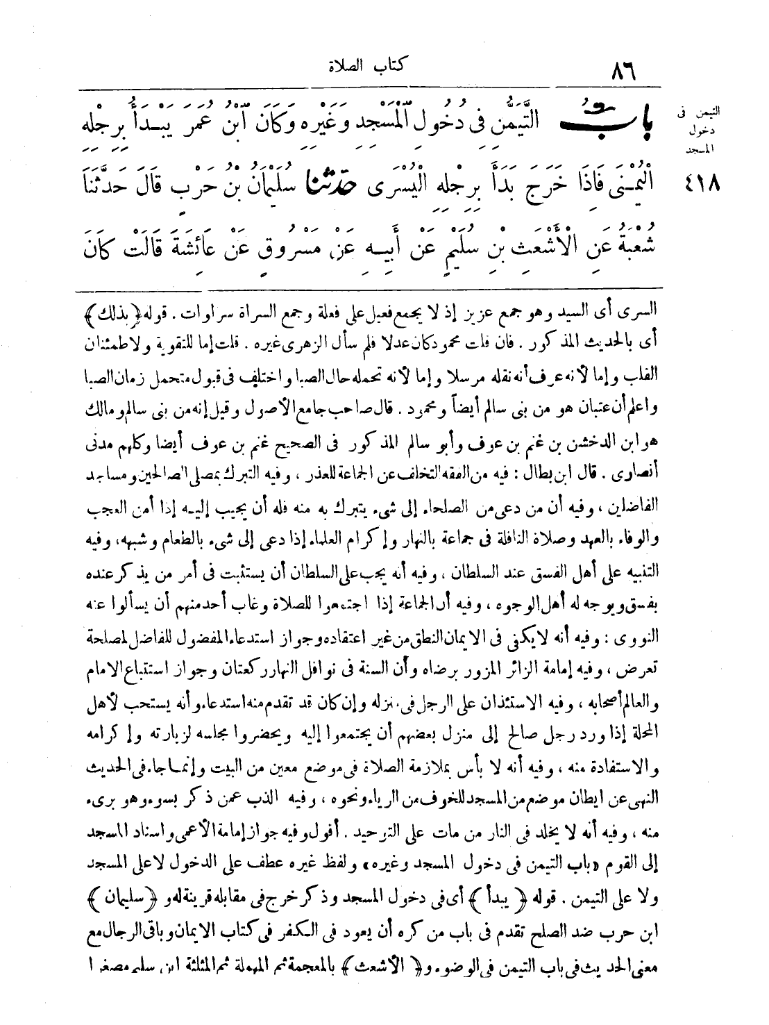 السري أي السيد وهو جمع عزيز إذ لا يجمع فعيل على فعلة وجمع السراة سراوات. قوله (بذلك) أي بالحديث المذكور، فإن قلت محمود كان عدلاً فلم سأل الزهري غيره. قلت إما للتقوية ولاطمئنان القلب وإما لأنه عرف أنه نقله مرسلاً وإما لأنه تحمله حال الصبا واختلف في قبول متحمل زمان الصبا واعلم أن عتيان هو من بني سالم أيضاً ومحمود. قال صاحب جامع الأصول وقيل إنه من بني سالم ومالك هو ابن الدخشن بن غنم بن عوف وأبو سالم المذكور في الصحيح غنم بن عوف أيضاً وكلهم مدني أنصاري. قال ابن بطال: فيه من الفقه التخلف عن الجماعة للعذر. وفيه التبرك بمصلى الصالحين ومساجد الفاضلين، وفيه أن من دعى من الصلحاء إلى شئ يتبرك به منه فله أن يجيب إليه إذا أمن العجب والوفاء بالعهد وصلاة النافلة في جماعة بالنهار وإكرام العلماء إذا دعي إلى شئ بالطعام وشبهه، وفيه التنبيه على أهل الفسق عند السلطان، وفيه أنه يجب على السلطان أن يستثبت في أمر من يذكر عنده بفسق ويوجه له أهل الوجوه، وفيه أن الجماعة إذا اجتمعوا للصلاة وغاب أحد منهم أن يسألوا عنه النووي: وفيه أنه لا يكفي في الإيمان النطق من غير اعتقاده وجواز استدعاء المفضول للفاضل لمصلحة تعرض، وفيه إمامة الزائر المزور برضاه وأن السنة في نوافل النهار ركعتان وجواز استتباع الإمام والعالم أصحابه، وفيه الاستئذان على الرجل في منزله وإن كان قد تقدم منه استدعاء وأنه يستحب لأهل المحلة إذا ورد رجل صالح إلى منزل بعضهم أن يجتمعوا إليه ويحضروا مجلسه لزيارته وإكرامه والاستفادة منه، وفيه أنه لا بأس بملازمة الصلاة في موضع معين من البيت وإنما جاء في الحديث النهي عن إيطان موضع من المسجد للخوف من الرياء ونحوه، وفيه الذب عمن ذكر بسوء وهو برئ منه، وفيه أنه لا يخلد في النار من مات على التوحيد. أقول وفيه جواز إمامة الأعمى وإسناد المسجد إلى القوم (باب التيمن في دخول المسجد وغيره) ولفظ غيره عطف على الدخول لا على المسجد ولا على التيمن. قوله (يبدأ) أي في دخول المسجد وذكر خرج في مقابله قرينة له و (سليمان) ابن حرب ضد الصلح تقدم في باب من كره أن يعود في الكفر في كتاب الأيمان وباقي الرجال مع معنى الحديث في باب التيمن في الوضوء و (الأشعث) بالمعجمة ثم المهملة ثم المثلثة ابن سليم مصغراً