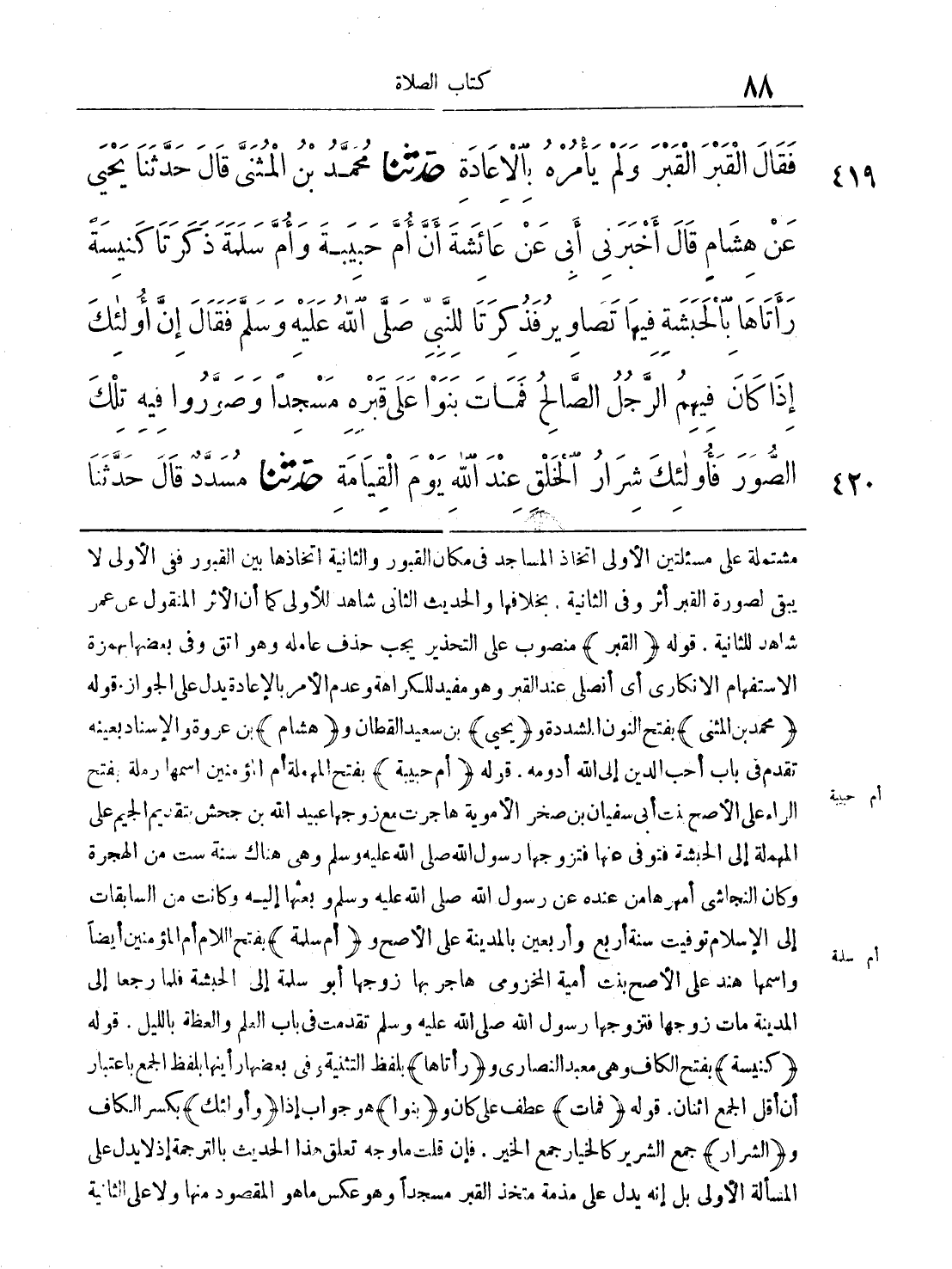 419 - حَدَّثَنَا مُحَمَّدُ بْنُ الْمُثَنَّى قَالَ حَدَّثَنَا يَحْيَى عَنْ هِشَامٍ قَالَ أَخْبَرَنِى أَبِى عَنْ عَائِشَةَ أَنَّ أُمَّ حَبِيبَةَ وَأُمَّ سَلَمَةَ ذَكَرَتَا كَنِيسَةً رَأَيْنَهَا بِالْحَبَشَةِ فِيهَا تَصَاوِيرُ، فَذَكَرَتَا لِلنَّبِىِّ - صلى الله عليه وسلم - فَقَالَ «إِنَّ أُولَئِكَ إِذَا كَانَ فِيهِمُ الرَّجُلُ الصَّالِحُ فَمَاتَ بَنَوْا عَلَى قَبْرِهِ مَسْجِدًا، وَصَوَّرُوا فِيهِ تِلْكَ الصُّوَرَ، فَأُولَئِكَ شِرَارُ الْخَلْقِ عِنْدَ اللَّهِ يَوْمَ الْقِيَامَةِ».