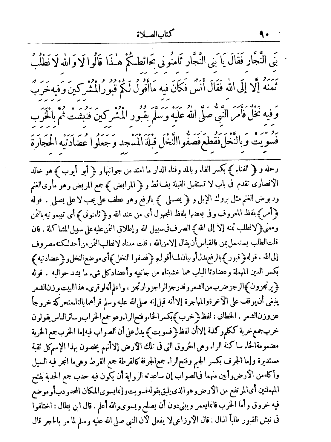 رحله و (الفناء) بكسر الفاء وبالمد وفناء الدار ما امتد من جوانبها و (أبو أيوب) هو خالد الأنصاري تقدم في باب لا تستقبل القبلة بغائط و (المرابض) جمع المربض وهو مأوى الغنم وربوض الغنم مثل بروك الإبل و (يصلي) بالرفع وهو عطف على يجب لا على يصلي. قوله (أمر) بلفظ المعروف وفي بعضها بلفظ المجهول أي من عند الله و (ثامنوني) أي تيمونيه بالثمن ومعنى (لا نطلب ثمنه إلا إلى الله) الصرف في سبيل الله وإطلاق الثمن عليه على سبيل المشاكلة، فإن قلت الطلب يستعمل بمن فالقياس أن يقال إلا من الله، قلت معناه لا نطلب الثمن من أحد لكنه مصروف إلى الله، قوله (قبور) بالرفع بدل أو بيان لما أقول و (فصفوا النخل) أي موضع النخل و (عضادتيه) بكسر العين المهملة وعضادتا الباب هما خشبتاه من جانبيه وأعضاد كل شئ ما يشد حواليه. قوله (يرتجزون) الرجز ضرب من الشعر وقد رجز الراجز وارتجز، واعلم أنه لو قرئ هذا البيت بوزن الشعر ينبغي أن يوقف على الآخرة والمهاجرة إلا أنه قيل أنه - صلى الله عليه وسلم - قرأهما بالتاء متحركة خروجاً عن وزن الشعر. الخطابي: لفظ (خرب) بكسر الخاء وفتح الراء وهو جمع الخراب وسائر الناس يقولون خرب جمع خربة ككلم وكلمة إلا أن لفظ (فسويت) يدل على أن الصواب فيه إما الخرب جمع الخربة مضمومة الخاء ساكنة الراء وهي الخروق التي في تلك الأرض إلا أنهم يخصون بهذا الاسم كل ثقبة مستديرة وإما الجرف بكسر الجيم وفتح الراء جمع الجرفة كالقرطة جمع القرط وهي ما انجر فيه السيل وأكله من الأرض وأبين منهما في الصواب إن ساعدته الرواية أن يكون فيه حدب جمع الحدبة بفتح المهملتين أي المرتفع من الأرض وهو الذي يليق بقوله فسويت وإنما يسوى المكان المحدودب أو موضع فيه خروق وأما الخرب فإنما يعمر ويبني دون أن يصلح ويسوي والله أعلم. قال ابن بطال: اختلفوا في نبش القبور طلباً للمال. قال الأوزاعي لا يفعل لأن النبي - صلى الله عليه وسلم - لما مر بالحجر قال