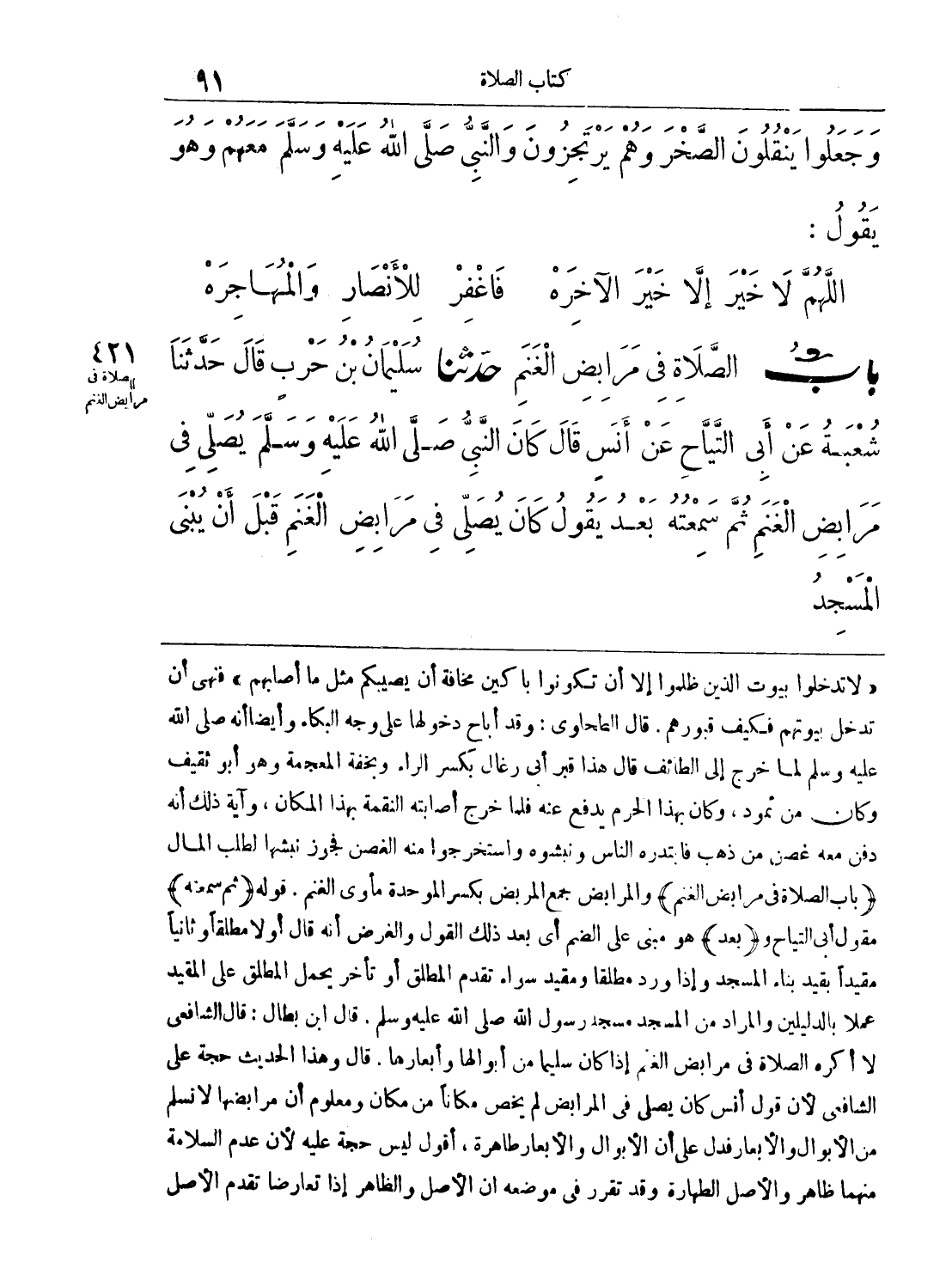 (لا تدخلوا بيوت الذين ظلموا إلا أن تكونوا باكين مخافة أن يصيبكم مثل ما أصابهم) فنهى أن تدخل بيوتهم فكيف قبورهم. قال الطحاوي: وقد أباح دخولها على وجه البكاء وأيضاً أنه - صلى الله عليه وسلم - لما خرج إلى الطائف قال هذا قبر أبي رغال بكسر الراء وبخفة المعجمة وهو أبو ثقيف وكان من ثمود، وكان بهذا الحرم يدفع عنه فلما خرج أصابته النقمة بهذا المكان، وآية ذلك أنه دفن معه غصن من ذهب فابتدره الناس ونبشوه واستخرجوا منه الغصن فجوز نبشها لطلب المال (باب الصلاة في مرابض الغنم) والمرابض جمع المربض بكسر الموحدة مأوى الغنم. قوله (ثم سمعنه) مقول أبي التياح و (بعد) هو مبنى على الضم أي بعد ذلك القول والغرض أنه قال أو لا مطلقاً وثانياً مقيداً بقيد بناء المسجد وإذا ورد مطلقاً ومقيد سواء تقدم المطلق أو تأخر يحمل المطلق على المقيد عملاً بالدليلين والمراد من المسجد مسجد رسول الله - صلى الله عليه وسلم -. قال ابن بطال: قال الشافعي لا أكره الصلاة في مرابض الغنم إذا كان سليماً من أبوالها وأبعارها. قال وهذا الحديث حجة على الشافعي لأن قول أنس كان يصلي في المرابض لم يخص مكاناً من مكان ومعلوم أن مرابضها لا نسلم من الأبوال والأبعار فدل على أن الأبوال والأبعار طاهرة، أقول ليس حجة عليه لأن عدم السلامة منهما ظاهر والأصل الطهارة وقد تقرر في موضعه أن الأصل والظاهر إذا تعارضا تقدم الأصل