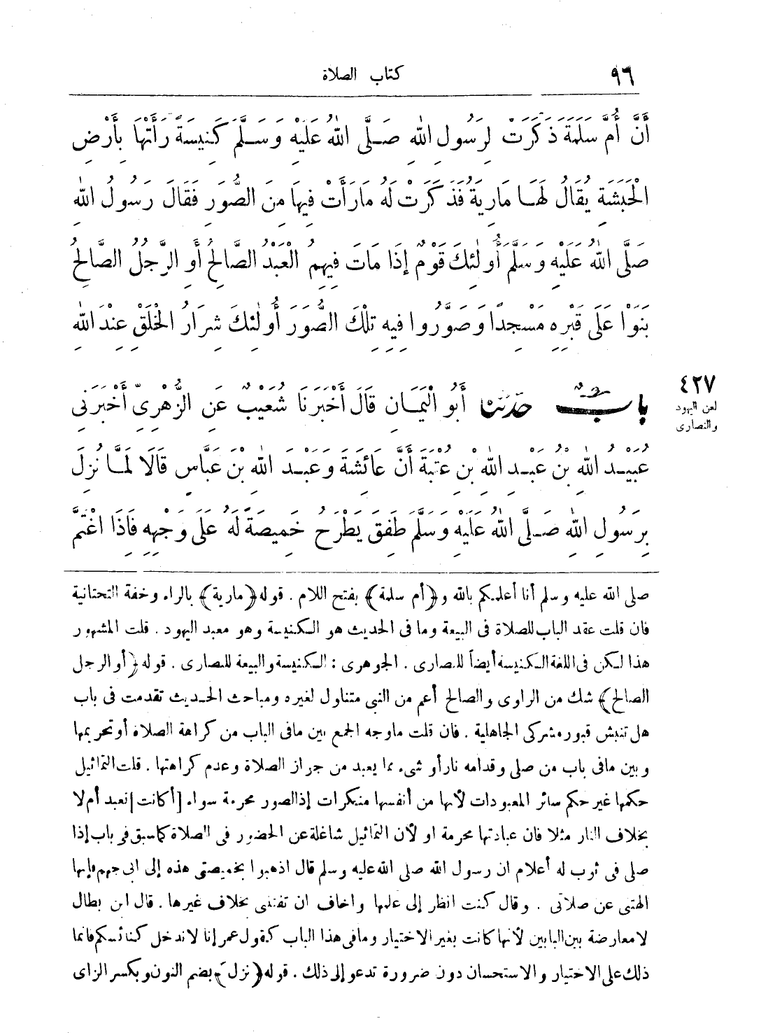 أَنَّ أُمَّ سَلَمَةَ ذَكَرَتْ لِرَسُولِ اللَّهِ - صلى الله عليه وسلم - كَنِيسَةً رَأَتْهَا بِأَرْضِ الْحَبَشَةِ يُقَالُ لَهَا مَارِيَةُ، فَذَكَرَتْ لَهُ مَا رَأَتْ فِيهَا مِنَ الصُّوَرِ، فَقَالَ رَسُولُ اللَّهِ - صلى الله عليه وسلم - «أُولَئِكَ قَوْمٌ إِذَا مَاتَ فِيهِمُ الْعَبْدُ الصَّالِحُ - أَوِ الرَّجُلُ الصَّالِحُ - بَنَوْا عَلَى قَبْرِهِ مَسْجِداً، وَصَوَّرُوا فِيهِ تِلْكَ الصُّوَرَ، أُولَئِكَ شِرَارُ الْخَلْقِ عِنْدَ اللَّهِ»