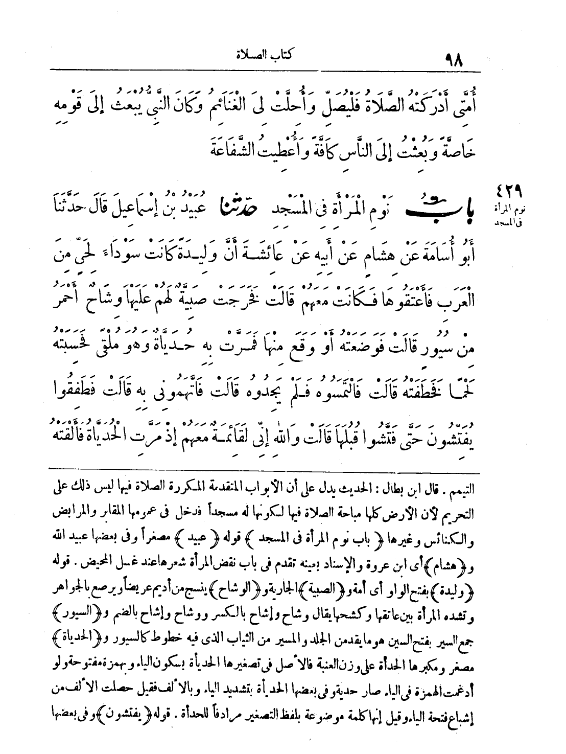 التيمم، قال ابن بطال: الحديث يدل على أن الأبواب المتقدمة المكررة الصلاة فيها ليس ذلك على التحريم لأن الأرض كلها مباحة الصلاة فيها لكونها له مسجداً فدخل في عمومها المقابر والمرابض والكنائس وغيرها (باب نوم المرأة في المسجد) قوله (عبيد) مصغراً وفي بعضها عبيد الله و (هشام) أي ابن عروة والإسناد بعينه تقدم في باب نقض المرأة شعرها عند غسل المحيض. قوله (وليدة) بفتح الواو أي أمة و (الصبية) الجارية و (الوشاح) ينسج من أديم عريضاً ويرصع بالجواهر وتشده المرأة بين عاتقها وكشحها يقال وشاح وإشاح بالكسر ووشاح وإشاح بالضم و (السيور) جمع السير بفتح السين هو ما يقد من الجلد والمسير من الثياب الذي فيه خطوط كالسيور و (الحدياة) مصغر ومكبرها الحدأة على وزن العنبة فالأصل في تصغيرها الحديأة بسكون الياء وبهمزة مفتوحة ولو أدعمت الهمزة في الياء صار حدية وفي بعضها الحديأة بتشديد الياء وبالألف فقيل حصلت الألف من إشباع فتحة الياء وقيل إنها كلمة موضوعة بلفظ التصغير مرادفاً للحدأة، قوله (يفتشون) وفي بعضها