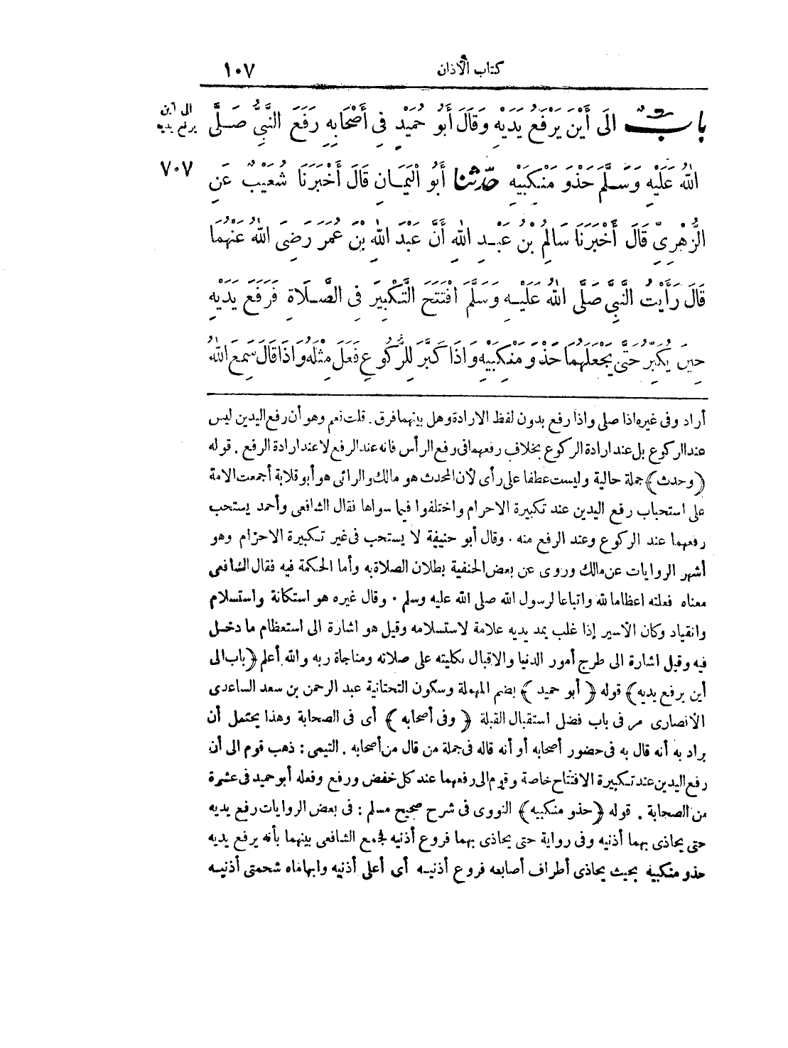 أراد وفي غيره إذا صلى وإذا رفع بدون لفظ الإرادة وهل بينهما فرق. قلت نعم وهو أن رفع اليدي ليس عند الركوع بل عند إرادة الركوع بخلاف رفعهما في رفع الرأس فإنه عند الفرع لا عند إرادة الرفع .. قوله (وحدث) جملة حالة وليس عطفا على رأى لأن المحدث مالم والراثي هو أبو قلابة أجمعت الأمة على استحباب رفع اليدين عند تكبيرة الإحرام واختلفوا فيما سواها فقال الشافعي وأحمد يستحب رفعها عند الركوع وعند الرفع منه. وقال أبو حنيفة لا يستحب في غير تكبيرة الإحرام وهو أشهر الروايات عن مالك وروى عن بعض الحنفية بطلان الصلاة به وأما الحكمة فيه فقال الشافعي فعلته اعظاما لله واتباعا لرسول الله صلى الله عليه وسلم. وقال غريره هو استكانة واستسلام وانقياد وكان الأسير إذا غلب يمد يديه علامة على استسلامه وقيل هو إشارة لإستعظام ما دخل فيه وقيل إشارة إلى طرح أمور الدنيا والإقبال بكليته على صلاته ومناجاة ربه والله أعلم (باب إلى أين يرفع يديه) قوله (أبو حميد) بضم المهملة وسكون التحتانة عبد الرحمن بن سعد الساعدي الأنصاري مر في باب استقبال القبلة (وفي أصحابه) أي في الصحابة وهذا يحتمل أن يراد به أنه قال به في حضور أصحابه أو أنه قاله في جملة من قال من أصحابه. التيمي: ذهب قوم إلى أن رفع اليدين عند تكبيرة الإفتتاح خاصة وقوم رفعها عند كل خفض ورفع وفعله أبو حميدة في عشيرة من الصحابة. قوله (حذو منكبيه) النووي في شرح صحيح مسلم: في بعض الروايات رفع ديه يحاذ بهما أذنيه وف رواية حتى يحاذي بهما فروع أذنيه فجمع الشافعي بينهما بأنه يرفع يديه حذو منكبيه بحيث يحاذي أطراف أصابعه فروع أذنيه أي أعلى أذنيه وإبهاماه شحمتي أذنيه