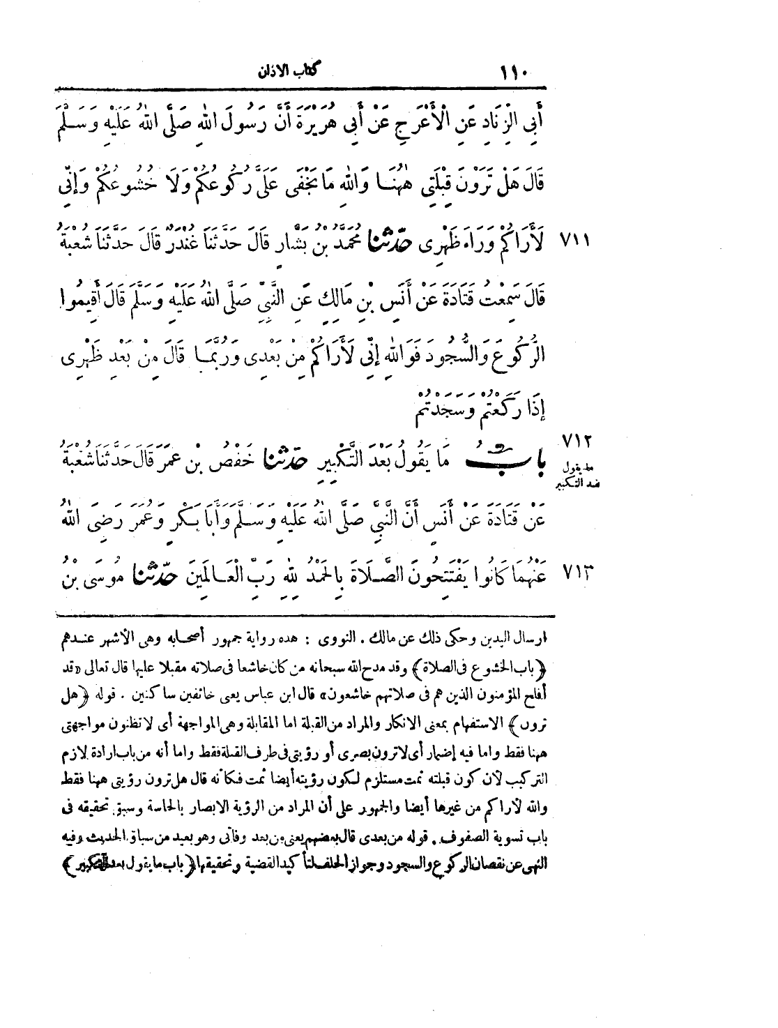 711 - حَدَّثَنَا مُحَمَّدُ بْنُ بَشَّارٍ قَالَ: حَدَّثَنَا غُنْدَرٌ قَالَ: حَدَّثَنَا شُعْبَةُ قَالَ: سَمِعْتُ قَتَادَةَ، عَنْ أَنَسِ بْنِ مَالِكٍ، عَنِ النَّبِيِّ صلى الله عليه وسلم قَالَ: أَقِيمُوا الرُّكُوعَ وَالسُّجُودَ فَوَاللَّهِ إِنِّي لأَرَاكُمْ مِنْ بَعْدِي، وَرُبَّمَا قَالَ مِنْ بَعْدِ ظَهْرِي - إِذَا رَكَعْتُمْ وَسَجَدْتُمْ.