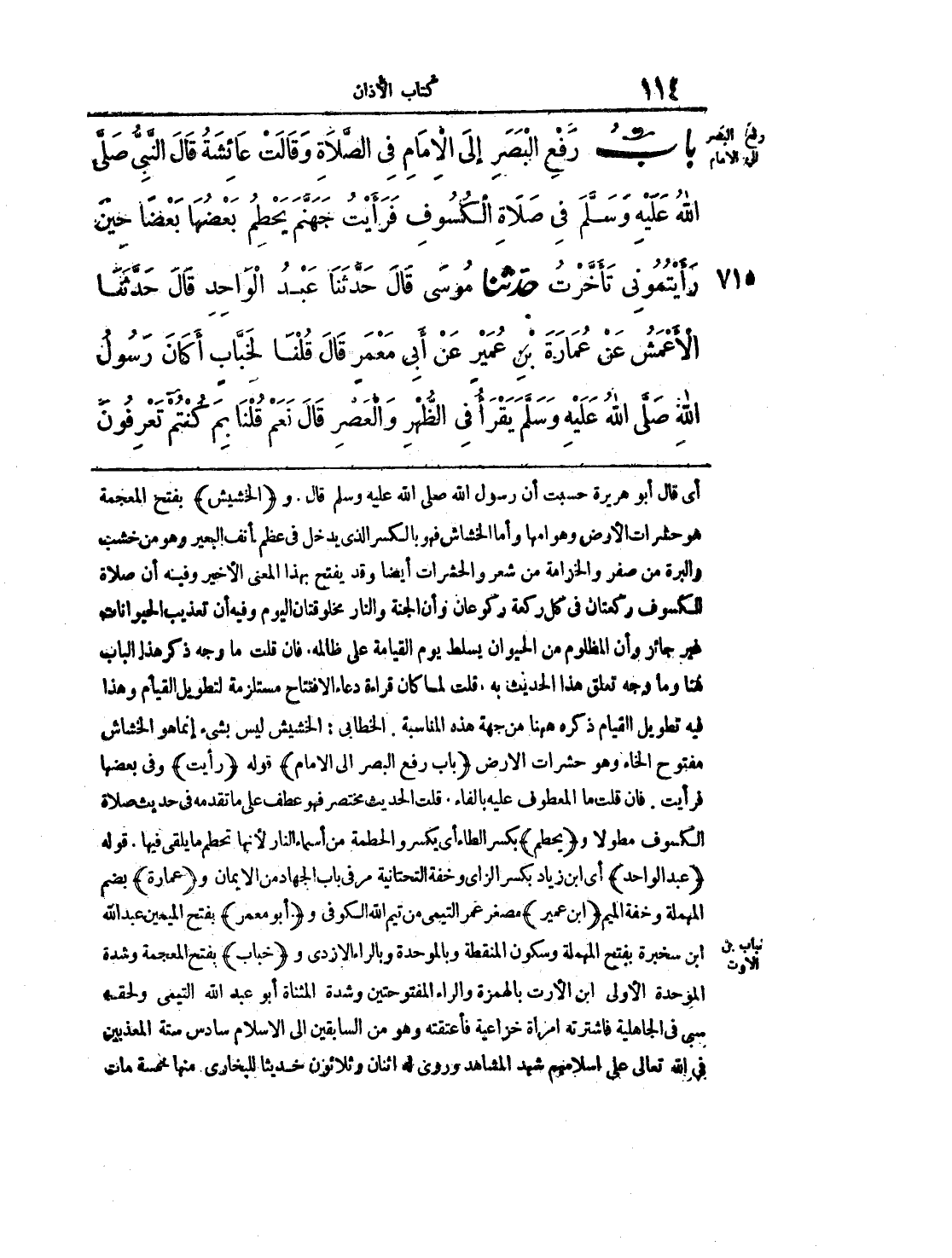 أي قال أبو هريرة حسبت أن رسول الله صلى الله عليه وسلم قال. و (الخشيش) بفتح المعجمة هو حشرات الأرض وهوامها وأما الخشاش فهو بالكسر الذي يدخل في عظم أنف العير وهو من خشب والبرة من صفر والخرامة من شعر والحشرات أيضا وقد يفتح بهذا المعنى الأخير وفيه أن صلاة الكسوف ركعتان وفي كل ركعة ركوعان وأن الجنة والنار مخلوقتان اليوم وفيه أن تعذيب الحيوانات غير جائز وأن المظلوم من اليوان يسلط يوم القيامة على ظالمه. فإن قلت ماوجه ذكر هذا الباب هنا وماوجه تعلق الحديث به. قلت لما كان دعاء الإفتتاح مستلزمة لتطويل القيام وهذا فيه تطويل القيام ذكره هنا من جهة هذه المناسبة. الخطابي: الخشيش ليس بشيء إنما هو الخشاش مفتوح الخاء وهو حشرات الأرض (باب رفع البصر إلى الأمام) قوله (رأيت) وفي بعضها فرأيت. فإن قلت ما المعطوف عليه بالفاء قلت الحديث مختصر فهو عطف غلى ما تقدمه في حديث صلاة الكسوف مطولا و (يحطم) بكسر الطاء والحطمة من أسماء النار لأنها تحطم ما يلقى فيها. قوله (عبدالواحد) أي ابن زياد بكسر الزاي وخفة التحتانية مر في باب الجهاد من الإيمان و (عمارة) بضم المهملة وخفة الميم (ابن عمير) مصغر عمر التيمي من تيم الله الكوفي و (أبو معمر) بفتح الميمين عبد الله بن مغيرة بفتح المهملة وسكون المنقطة وبالموحدة وبالراء الأزدي و (خباب) بفتح المعجمة وشدة الموحدة الأولى ابن الأرت بالهمزة والراء المفتوحتين وشدة المثناة أبو عبد الله التيمي ولحقه في الجاهلية فاشترته امرأة خزاعية فأعتقته وهو من السابقين في الإسلام سادس ستة المعذبين في الله تعالى على إسلامهم شهد المشاهد وروي له اثنان وثلاثون حديثا للبخاري منها خمسة مات
