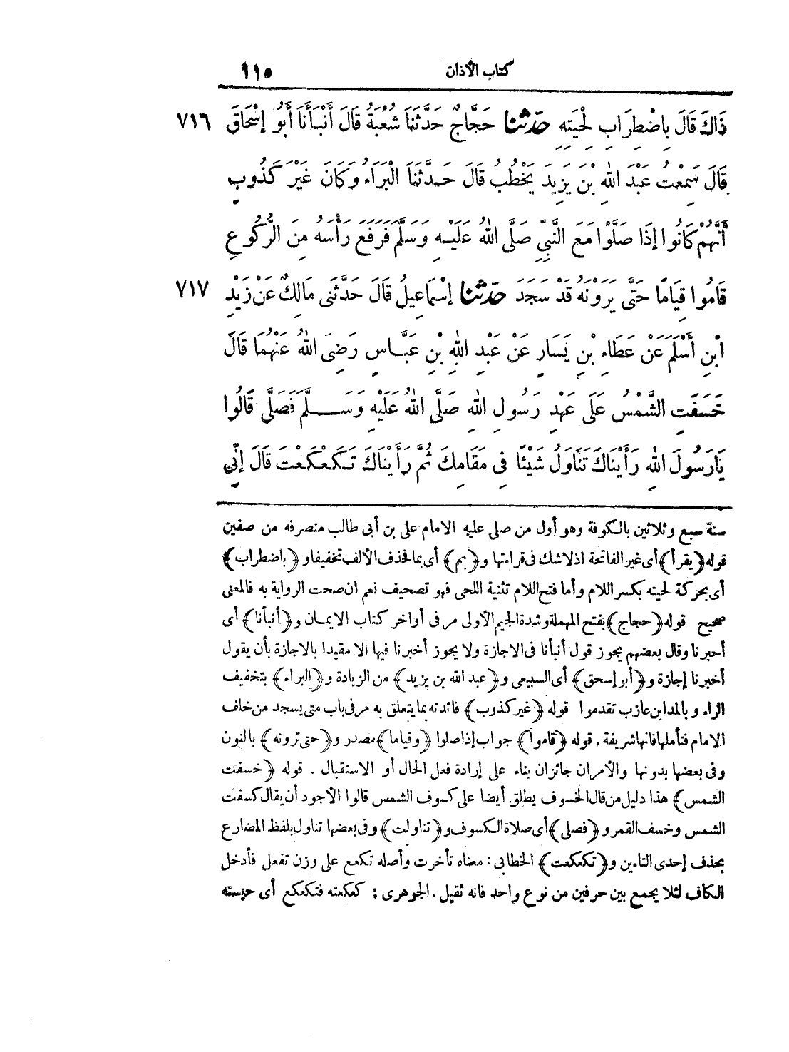 سنة سبع وثلاثين بالكوفة وهو أول من صلى عليه الإمام علي بن أبي طالب منصرفه من صفين قوله (يقرأ) أي غير الفاتحة إذ لا شك في قراءتها و (بم) أي بما فحذف الألف تخفيفا و (باضطراب) أي بحركة لحيته بكسر اللام تثنية اللحى فهو تصحيف نعم ان صحت الرواية به فالمعنى صحح قوله (حجاج) بفتح المهملة وشدة الجيم الأولى مر في أواخر كتاب الإيمان و (أنبأنا) أي أخبرنا وقال بعضنهم يجوز قول أنبأنا في الإجازة ولا يجوز أخبرنا فيها إلا مقيدا بالإجازة بأن يقول أخبرنا إجازة و (أبو إسحاق) السبيعي و (عبد الله بن يزيد) من الزيادة و (البراء) بتخفيف الراء وبالمد ابن عازب تقدموا قوله غير (كذوب) فائدته بما يتعلق به مر في باب متى يسجد من خلف الإمام فتأملها فإنها شريفة. قوله (قاموا) جواب إذا صلوا و (قياما) مصدر و (حتى ترونه) بالنون وفي بعضها بدونها والأمرا جائزان بناء على إرادة فعل الحال أو الإستقبال قوله (خسفت الشمس) هذا دليل من قال أيضا الخسوف يطلق أيضا على كسوف الشمس قالوا الأجود أن تقال كسفت الشمس وخسف القمر و (فصلى) أي صلاة الكسوف و (تناولت) وفي بعضها تناول بلفظ المضارع يحذف إحدى التائين و (تكعكعت) الخطابي: معناه تأخرت وأصله تكعع على وزن تفعل فأدخل الكاف لئلا يجمع بين حرفين من نوع واحد فهو ثقيل. الجوهري: كعكعته فتكعكع أي حبسته