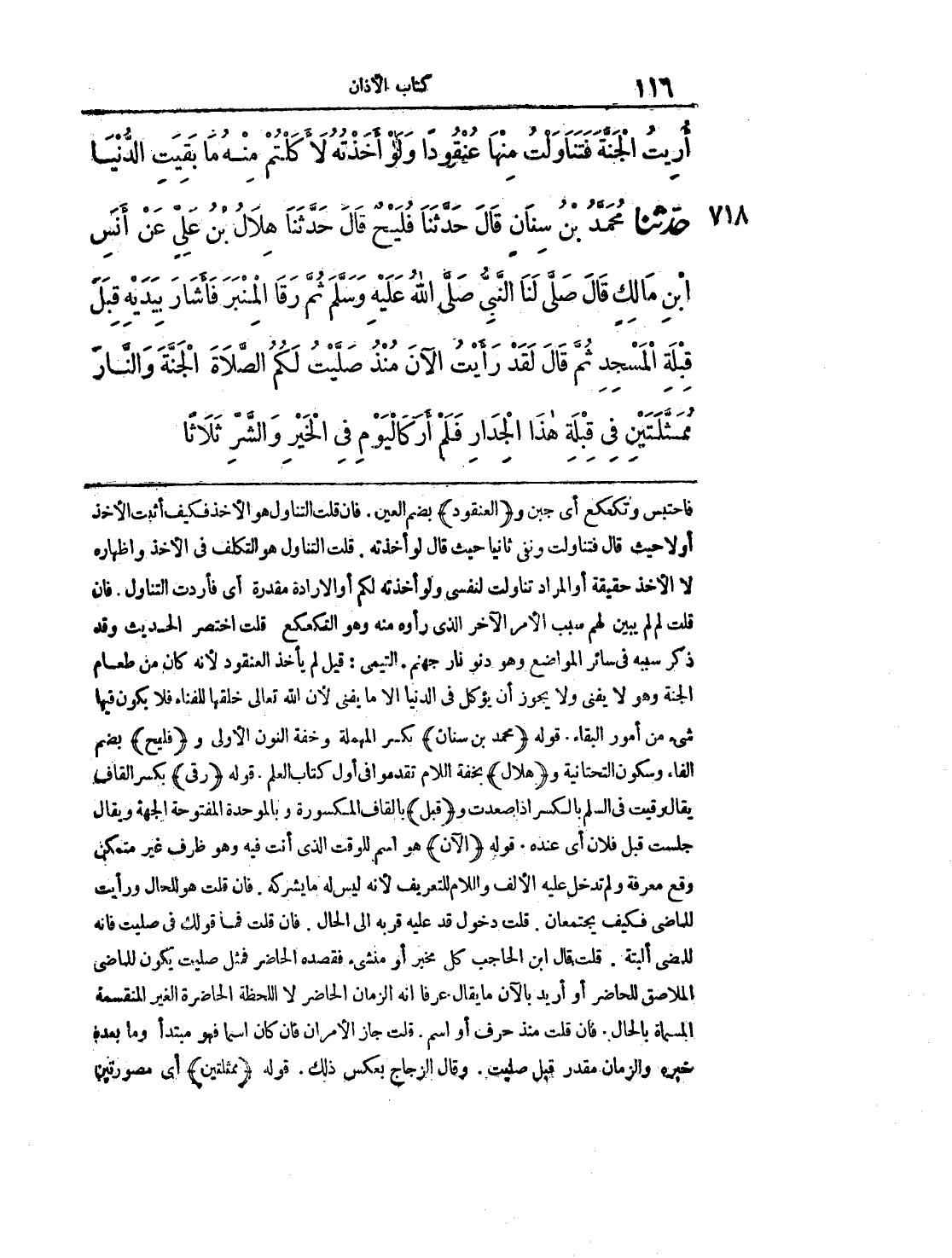 718 - حَدَّثَنَا مُحَمَّدُ بْنُ سِنَانٍ قَالَ: حَدَّثَنَا فُلَيْحٌ قَالَ: حَدَّثَنَا هِلاَلُ بْنُ عَلِيٍّ، عَنْ أَنَسِ بْنِ مَالِكٍ قَالَ صَلَّى لَنَا النَّبِيُّ صلى الله عليه وسلم ثُمَّ رَقَا الْمِنْبَرَ فَأَشَارَ بِيَدَيْهِ قِبَلَ قِبْلَةِ الْمَسْجِدِ ثُمَّ قَالَ لَقَدْ رَأَيْتُ الآنَ مُنْذُ صَلَّيْتُ لَكُمُ الصَّلاَةَ الْجَنَّةَ وَالنَّارَ مُمَثَّلَتَيْنِ فِي قِبْلَةِ هَذَا الْجِدَارِ فَلَمْ أَرَ كَالْيَوْمِ فِي الْخَيْرِ وَالشَّرِّ ثَلاَثًا