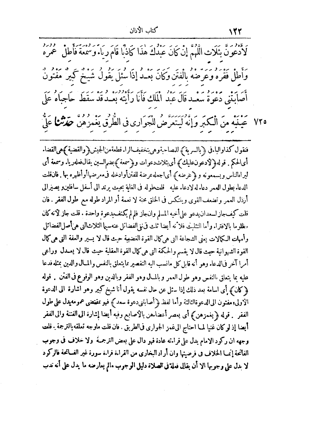 فنقول كذا والباء في (بالسرية) للمصاحبة وهي بتخفيف الراء قطعة من الجميش والقضية هي القضاء عأي حكم قوله (لأدعون عليك) أي بثلاث دعوات و (سمعة) بضم السين يقال فعله رياء وسمعة أي ليراه الناس ويسمعونه و (عرضه) أي جعله عرضة للفتن أو ادخله في معرضها أو اظهر هبها فان قلت الدعاء بطول العمر دعاء له لادعاء عليه قلت طوله في الغاية بحيث يرتد الى أسفل سافلين ويصير الى ارذل العمر وتضعف القوى ونتكس في الخلق محنة لا نعمة أو المراد طوله مع طول الفقر فان قلت كيف جاز لسعدان ان يدعو على أخيه المسلم وان جاز فم لم يكتف بدعوة واحدة. قلت جاز لأنه كان مظلوما بالإفتراء وأما التثليث فلأنه أيضا ثلث في نفي الفضائل عنه سيما الثلاث التي هي أصل الفضائل وأمهات الكمالات يعني الشجاعة التي هي كمال القوة الغضبية حيث قال لا يسير والعفة التي هي كمال القوة الشهوانية حيث قال لا يقسم والحكمة التي هي كمال القوة العقلية حيث قال لا يعدل وراعي أمرا آخر في الدعاء وهو أنه قابل كل ما نسب اليه التقصير مما يتعلق بالنفس والمال والدين ممثله فدعا عليه بما يتعلق بالنفس وهو طول العمر والمال وهو الفقر والدين والوقوع في الفتن قوله (كان) أي أسامة بعد ذلك إذا سئل عن حال نفسه يقول أنا شيخ كبير وهو إشارة إلى الدعوة الأولى ومفتون إلى الدعوة الثالثة وأما لفظ أصابتني دعوة سعد فهو بمقتضى عمومه دل على طول الفقر قوله (يغمزهن) أي يعصر أعضاءهن بالأصابع وفيه إشارة أيضا إلى الفتنة وإلى الفقر أيضا ذ لو كان غنيا لما احاج إلى لمز الجواري في الطريق. فان قلت ما وجه تعلقه بالترجمة قلت وجهه أن ركود الإمام يدل على قراءته عادة فهو دال على بعض الترجمة ولا خلاف في وجوب الفاتحة إنما خلاف في فرضيتها وان اراد البخاري من القراءة قراءة صورة غير الفاتحة فالركود لابد على وجوبها الا أن يقال فعله في الصلاة دليل على الوجوب ما لم يعارضه ما يدل على أنه ندب