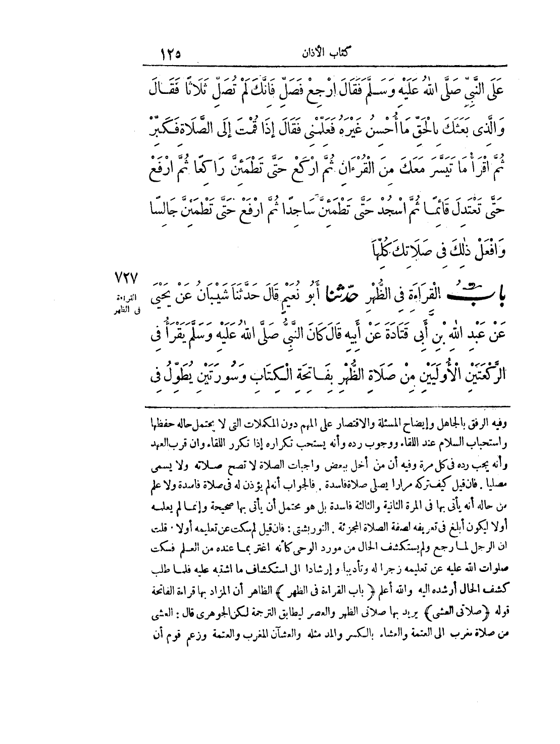 وفيه الرفق بالجاهل وإيضاح المسألة والاقتصار على المهم دون المكملات التي لا يحتمل حالهه حفظها واستحباب السلام عند اللقاء ووجوب رده وأنه يستحب تكراره إذا تكرر اللقاء وان قرب العهد وأنه حب رده في كل مرة وفيه أن من أخل ببعض واجبات الصلاة لا تصح صلاته ولا يسمى مصليا. فان قيل كيف تركه مرارا يصلي صلاة فاسدة فالجواب أنه لو يؤذن له في صلاة فاسدة ولا علم من حاله أنه أتي بها في المرة الثانية والثالثة فاسدة بل هو محتمل أن يأتي بها صحيحة وإنما لم يعلمه أولا ليكون أبلغ ف تعريفه للصلاة المجزئة. النوربشتي: فان قيل لم سكت عن تعليمه أولا قلت ان الرجل لما رجع ولم يستكشف الحال من مورد الوحي كأنه اغتر بما عنده من العلم فسكت صلوات الله عليه تعليمه زجرا له وتأديبا وإرشادا الى استكشاف ما اشتبه عليه فلما طلب كشف الحال أرشده اليه والله أعلم (باب القراءة في الظهر) الظاهر أن المراد بها قراءة الفاتحة قوله (صلاتي العشى) يريد بها صلاتي الظهر والعصر ليطابق الترجمة لكن الجوهري قال: العشي من صلاة المغرب الى العتمة والعشاء والكسر والمد مثله والعشآن المغرب والعتمة وزعم قوم أن