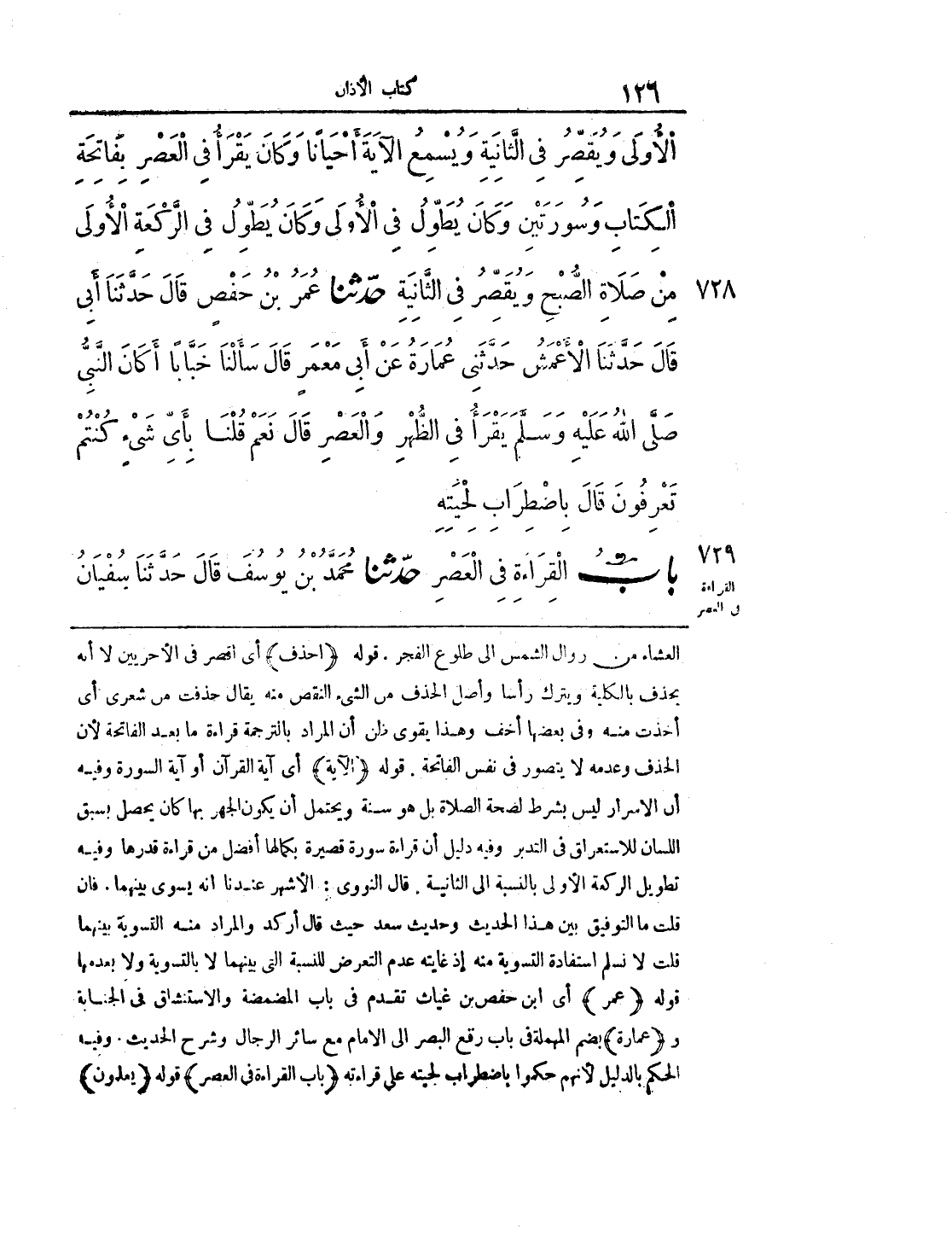 العشاء من زوال الشمر الى طلوع الفجر. قوله (احذف) أي اقصر الأخريين لا أنه حذف بالكلية ويترك رأسا واصل الحذف من الشيء النقص منه يقال حذفت من شعري أي أخذت منه وفي بعضها أخف وهذا قوي فلن أن المراد بالترجمة قراءة ما بعد الفاتحة لأن الحذف وعدمه لا يتصور في نفس الفاتحة. قوله (الآية) أي آية القرآن أو آية السورة وفيه أن الأسرار ليس بشرط لصحة الصلاة بل هو سنة ويحتمل أن يكون الجهر بها يحصل بسبق اللسان للاستغراق في التدبر وفيه دليل أن قراءة سورة قصيرة بكمالها أفضل من قراءة قدرها وفيه تطويل الركعة الأولى بالنسبة الى لثانية. قال النووي: الأشهر عندنا أنه يسو بينهما. فان قلت ما التوفق بين هذا الحديث وحدث سعد حيث قال أركد والمراد منه التسوية بينهما قلت لا نسلم استفادة التسوية منه إذ غايته عدم التعرض للنسبة التي بينهما لا بالتسوية ولا بعدمها قوله (عمر) أي ابن حفص بن غاث تقدم في باب المضمضة والاستنشاق في الجنابة و (عمارة) بضم المهملة في باب رفع البصر الى الامام مع سائر الرجال وشرح الحديث وفيه الحكم بالدليل لأنهم حكموا باضطراب لحيته على قراءته (باب القراءة في العصر) قوله (يعلمون)