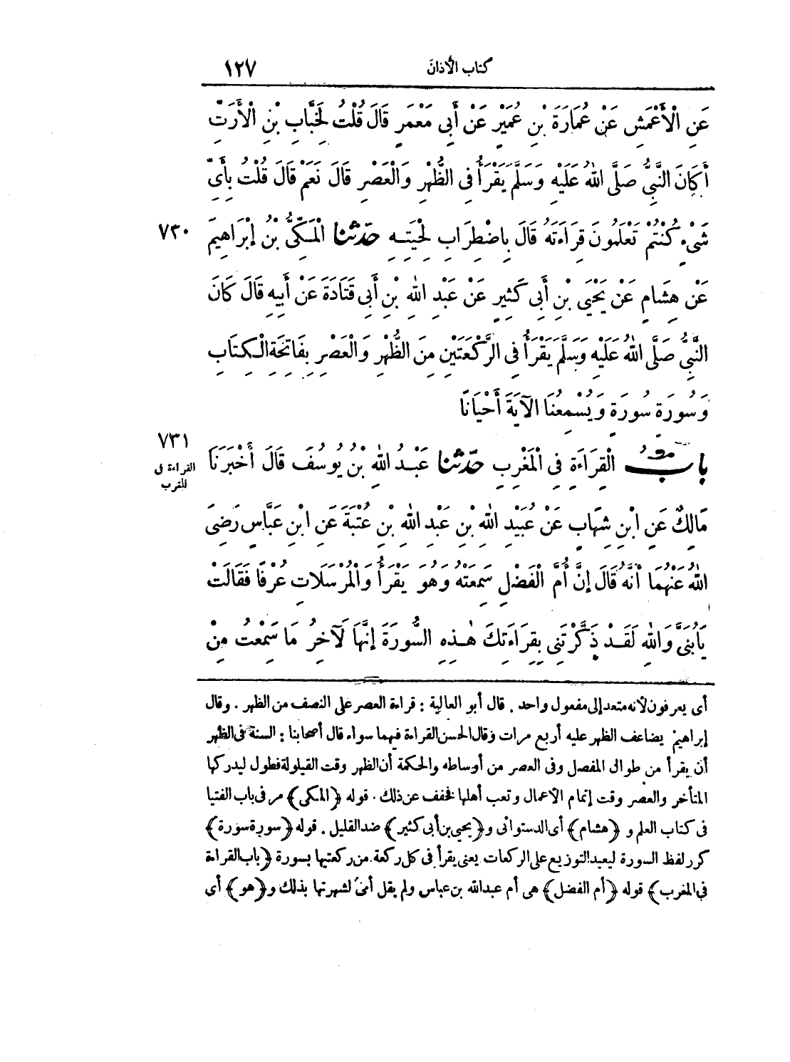 731 - حَدَّثَنَا عَبْدُ اللهِ بْنُ يُوسُفَ قَالَ: أَخْبَرَنَا مَالِكٌ، عَنِ ابْنِ شِهَابٍ عَنْ عُبَيْدِ اللهِ بْنِ عَبْدِ اللهِ بْنِ عُتْبَةَ، عَنِ ابْنِ عَبَّاسٍ، رَضِيَ اللَّهُ عَنْهُمَا أَنَّهُ قَالَ إِنَّ أُمَّ الْفَضْلِ سَمِعَتْهُ وَهُوَ يَقْرَأُ {وَالْمُرْسَلاَتِ عُرْفًا} فَقَالَتْ يَا بُنَيَّ وَاللَّهِ لَقَدْ ذَكَّرْتَنِي بِقِرَاءَتِكَ هَذِهِ السُّورَةَ إِنَّهَا لآخِرُ مَا سَمِعْتُ مِنْ