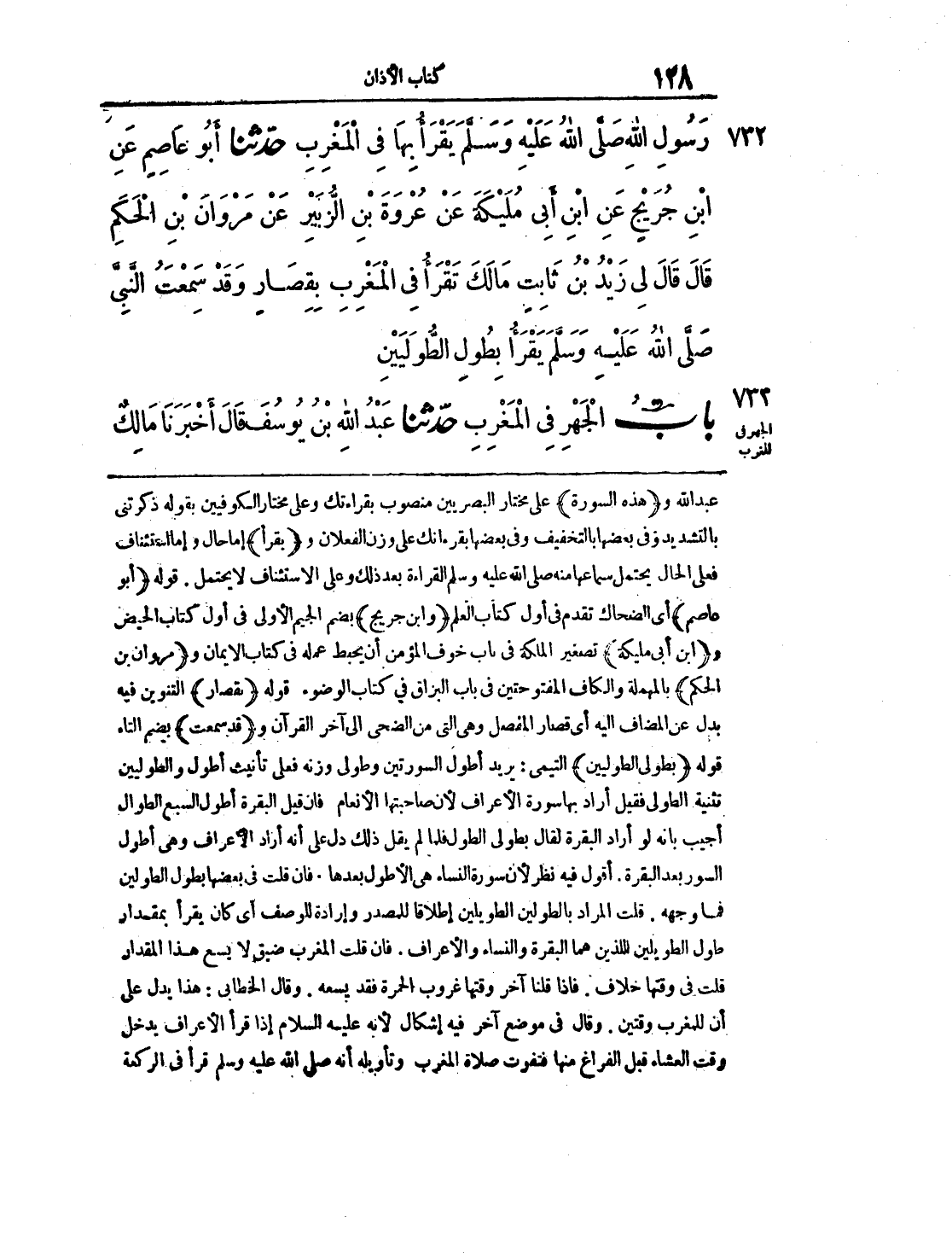 عبد الله و (هذه السورة) على مختار البصريين منصوب بقرءته وعلى مختار الكوفيين بقوله ذكرتني بالتشديد وفي بعضها بالتخفيف وفي عضها بقرءانك على وزن الفعلان و (بقرا) إما حال وإما استئناف فعلى الحال يحتمل سماعها منه صلى الله عليه وسلم القراءة بعد ذلك وعلى الستئناف لا يحتمل. قوله (أبو عاصم) أي الضحاك تقد في أول كتاب العلم (وابن جريج) يضم الجيم اأولى في أول كتاب الحض و (ابن أبي مليكة) تصغير الملكة في باب خوف المؤمن أن حيط عمله في كتاب الايمان و (مروان بن الحكم) بالمهملة والكاف المفتوحتين في باب البزاق ف كتاب الوضوء قوله (بقصار) التنوين فيه بدل عن المضاف اليه اي قصار المفصل وهي التي من الضحى الى آخر القرآن و (قد سمعت) بضم التاء قوله (بطولي الطوليين) التيمي: يريد أطول السورتين وطولي وزنه فعلى تأنيث أطول والطوليين تثنية الطولى فقيل أراد بها سورة الأعراف لأن صاحبتها الأنعام فان قيل البقرة أطول السباع الطوال أجيب بانه لو أراد البقرة لقال بطواي الطول فلما لم يقل ذلك دل أنه أراد الأعراف وه أطول السو بعد البقرة. أقول فيه نظر لأن سورة النساء هـ الطول بعدها. فان قلت في بعضها بطول الطولين فما وجهه. قلت المراد بالطولين الطويلين إطلاقا للمصدر وارادة للوصف أي كان يقرأ بمقدار طول الطويلين اللذين هما البقرة والنساء والأعراف. فان قلت المغرب ضيق لا يسع هذا المقدار قلت في وقتها خلاف. فاذا قلنا آخر وقتها غروب الحمرة فقد يسعه. وقال الخطابي: هذا يدل على أن للمغرب وقتين. وقال في موضع آخر فيه إشكال لأنه عليه السلام إذا رأ الأعراف يدخل وقت العشاء قبل الفراغ منها فتفوت صلاة المغرب وتأويله أنه صلى الله عليه وسلم قرأ في الركعة