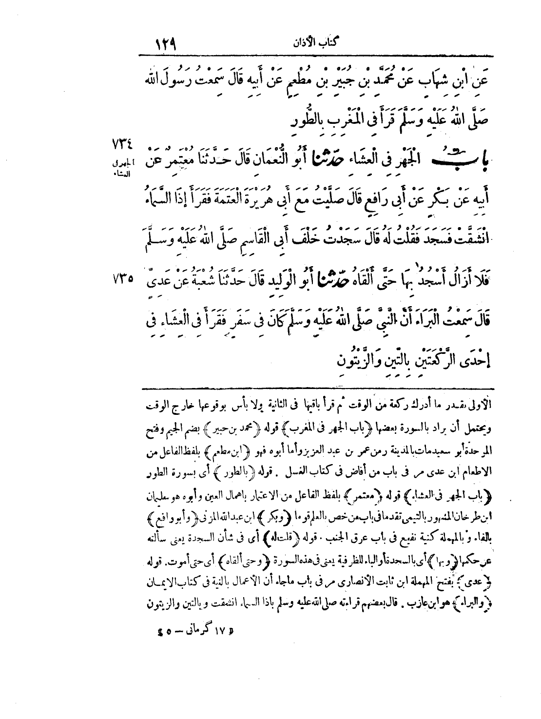 الأولى بقدر ما أدرك ركعة من الوقت قرأ باقيها في الثانية ولابأس بوقوعها خارج الوقت ويحتمل أن يراد بالسورة بعضها (باب الجهر في المغرب) قوله (محمد بن جبير) بضم الجيم وفتح الموحدة أبو سعيد مات بالمدينة ومن عمر بن عبدالعزز وأما أبوه فهو (ابن مطعم) فلفذ الفاعل من الاطعام ابن عدي مر في باب من أفاض ف كتاب الغسل. قوله (بالطور) أي بسورة الطور (باب الجهر في العشاء) قوله (معتمر) بلفظ الفاعل من الاعتمار باهمال العين وأبوه هو سليمان ابن طرخان المشهور بالتيمي تقدم في باب من خص بالعلم قوما (وبكر) ابن عبدالله المزني (وأبو واقع) بالفاء وبالمهمله كنية نفيع في باب عرق الجنب. قوله (قلت له) أي في شأن السجدة يعني سألته عن حكمها (وبها) أي بالسجدة أو الباء للظرفية يعني في هذه السورة (وحتى ألقاه) أي حتى أموت. قوله (عدي) بفتح المهملة ابن ثابت الأنصاري مر في باب ما جاء أن الأعمال بالنية في كتاب الايمان (والبراء) هو ابن عازب. قال بعضهم قراءته صلى الله عله وسلم باذا السماء انشقت وبالتين والزيتون