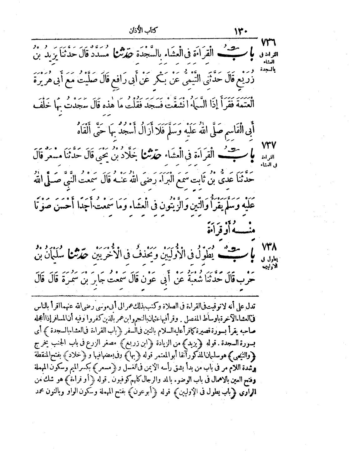 737 - حَدَّثَنَا خَلاَّدُ بْنُ يَحْيَى قَالَ: حَدَّثَنَا مِسْعَرٌ قَالَ: حَدَّثَنَا عَدِيُّ بْنُ ثَابِتٍ سَمِعَ الْبَرَاءَ، رَضِيَ اللَّهُ عَنْهُ، قَالَ: سَمِعْتُ النَّبِيَّ صلى الله عليه وسلم يَقْرَأُ {وَالتِّينِ وَالزَّيْتُونِ} فِي الْعِشَاءِ وَمَا سَمِعْتُ أَحَدًا أَحْسَنَ صَوْتًا مِنْهُ، أَوْ قِرَاءَةً.