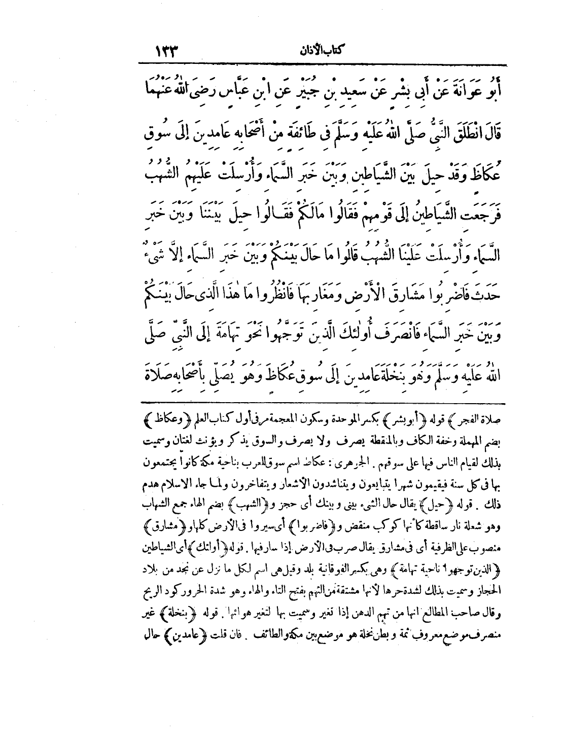 أَبُو عَوَانَةَ، عَنْ أَبِي بِشْرٍ، عَنْ سَعِيدِ بْنِ جُبَيْرٍ، عَنِ ابْنِ عَبَّاسٍ، رَضِيَ اللَّهُ عَنْهُمَا، قَالَ: انْطَلَقَ النَّبِيُّ صلى الله عليه وسلم فِي طَائِفَةٍ مِنْ أَصْحَابِهِ عَامِدِينَ إِلَى سُوقِ عُكَاظٍ وَقَدْ حِيلَ بَيْنَ الشَّيَاطِينِ وَبَيْنَ خَبَرِ السَّمَاءِ وَأُرْسِلَتْ عَلَيْهِمُ الشُّهُبُ فَرَجَعَتِ الشَّيَاطِينُ إِلَى قَوْمِهِمْ فَقَالُوا مَا لَكُمْ فَقَالُوا حِيلَ بَيْنَنَا وَبَيْنَ خَبَرِ السَّمَاءِ وَأُرْسِلَتْ عَلَيْنَا الشُّهُبُ قَالُوا مَا حَالَ بَيْنَكُمْ وَبَيْنَ خَبَرِ السَّمَاءِ إِلاَّ شَيْءٌ حَدَثَ فَاضْرِبُوا مَشَارِقَ الأَرْضِ وَمَغَارِبَهَا فَانْظُرُوا مَا هَذَا الَّذِي حَالَ بَيْنَكُمْ وَبَيْنَ خَبَرِ السَّمَاءِ فَانْصَرَفَ أُولَئِكَ الَّذِينَ تَوَجَّهُوا نَحْوَ تِهَامَةَ إِلَى النَّبِيِّ صلى الله عليه وسلم وَهْوَ بِنَخْلَةَ عَامِدِينَ إِلَى سُوقِ عُكَاظٍ وَهْوَ يُصَلِّي بِأَصْحَابِهِ صَلاَةَ