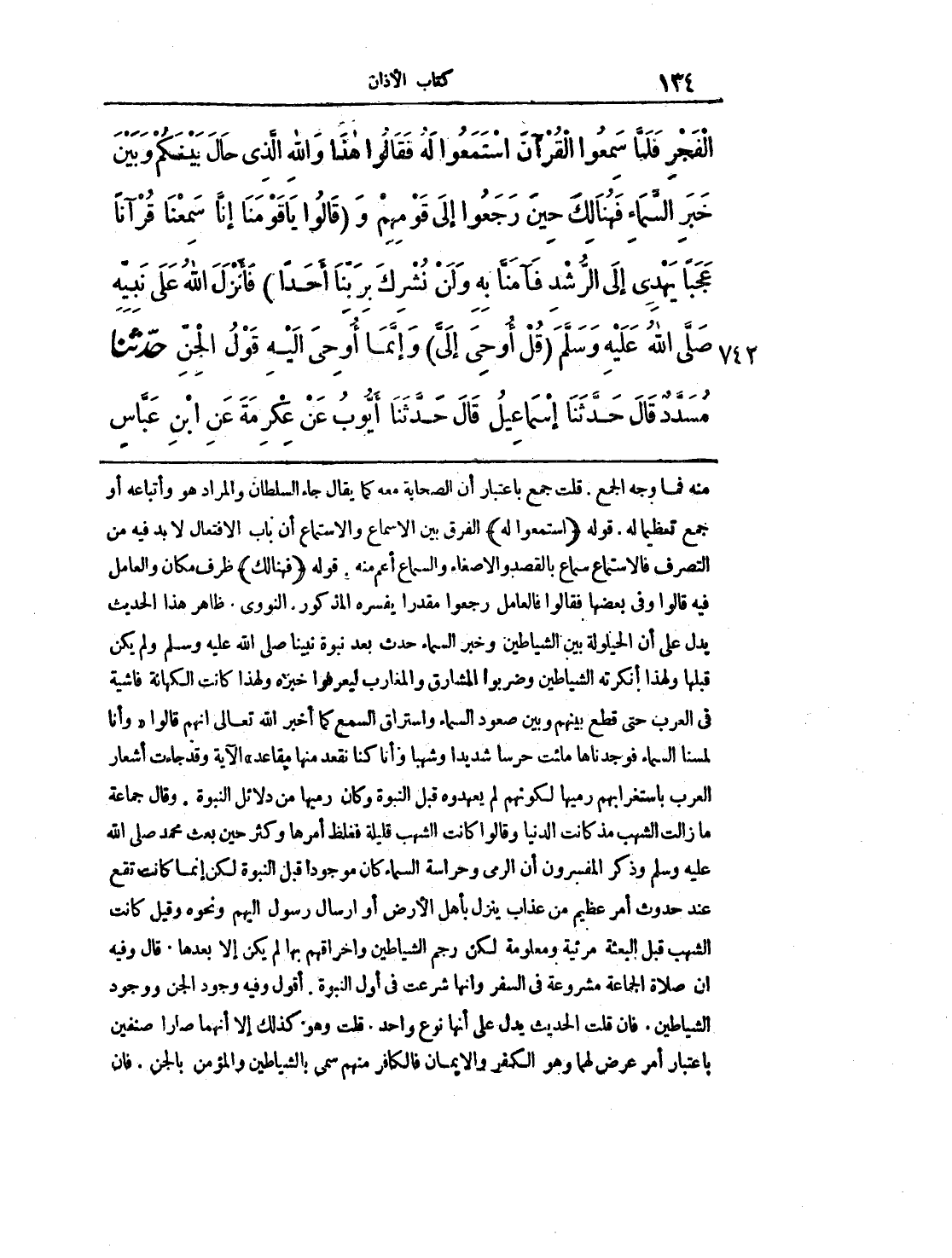 الْفَجْرِ فَلَمَّا سَمِعُوا الْقُرْآنَ اسْتَمَعُوا لَهُ فَقَالُوا هَذَا وَاللَّهِ الَّذِي حَالَ بَيْنَكُمْ وَبَيْنَ خَبَرِ السَّمَاءِ فَهُنَالِكَ حِينَ رَجَعُوا إِلَى قَوْمِهِمْ وَقَالُوا يَا قَوْمَنَا {إِنَّا سَمِعْنَا قُرْآنًا عَجَبًا يَهْدِي إِلَى الرُّشْدِ فَآمَنَّا بِهِ وَلَنْ نُشْرِكَ بِرَبِّنَا أَحَدًا} فَأَنْزَلَ اللَّهُ عَلَى نَبِيِّهِ صلى الله عليه وسلم {قُلْ أُوحِيَ إِلَيَّ} وَإِنَّمَا أُوحِيَ إِلَيْهِ قَوْلُ الْجِنِّ.