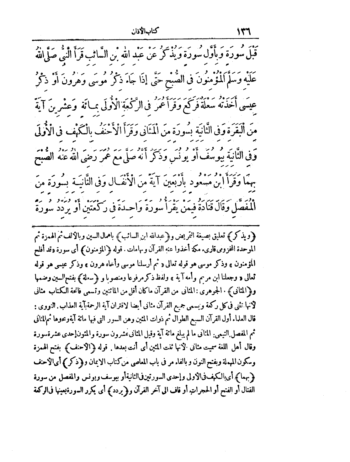 (ويذكر) تعليق بصيغة التمريض و (عبدالله بن السائب) باهمال السين وبالألف ثم الهمزة ثم الموحدة المخزومي قرئ مكة أخذوا عنه القرآن وهامات. قوله (المؤمنون) أي سورة ((وقد أفلح المؤمنون)) وذكر موسى هو قوله تعالى ((ثم أرسلنا موسى وأخاه هارون)) وذكر عيسى هو قوله تعالى ((وجعلنا ابن مريم وأمه آية)) ولفظ ذكر مرفوعا ومنصوبا و (سعلة بفتح السين وضمها و (المثاني).الجوهير: المثاني من القرآن ما كان أقل من المائتين وتسمى فاتحة الكتاب مثاني لأنها تثنى ف كل ركعة وسمي جميع القرآن مثان أيضا لاقتران آة الرحمة بآة العذاب. النووي: قال العلماء أول القرآن السبع الطوال ثو ذوات المئين وهن السور الت فيها مائة آة ونحوها ثم المثاني والمفصل. التيمي: المثاني ما لم يبلغ مائة آية وقيل المثاني عشرون سورة والمئون إحدى عشرة سورة وقال أهل اللغة سميت مثاني لأنها ثنت المئين أي أتت بعدها. قوله (الأحنف) بفتح الهمزة وسكون المهملة وبفتح النون وبالفاء مر في باب المعاصي من كتاب الأمان و (ذكر) أي الأحنف (بهما) أي بالكهف في الأولى وإحدى السورتين في الثانية أو بيوسف وونس والمفصل من سورة القتال أو الفتح أو الحجرات أو قاف الى آخر القرآن و (يردد) أي يكرر السورة بعينها في الركعة