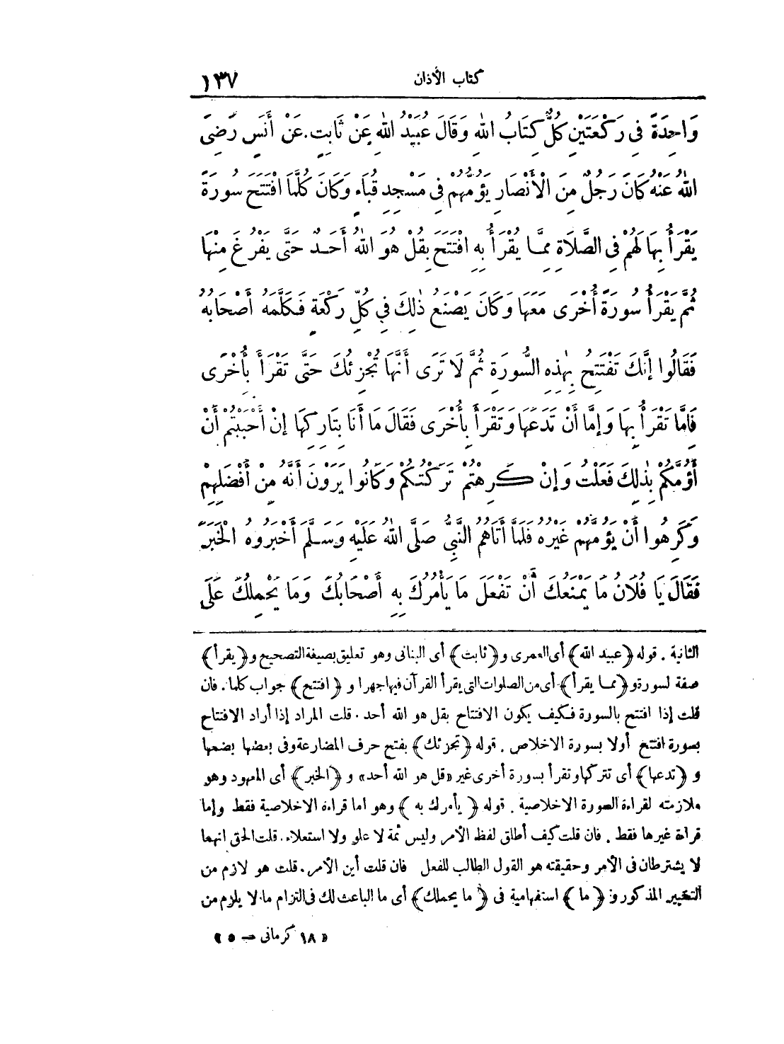 الثانية. قوله (عبيد الله) أي العمري و (ثابت) أي البناني وهو تعليق بصيغة التصحيح و (يقرأ) صفة لسورة و (مما يقرأ) أي من الصلوات التي يقرأ القرآن فيها جهرا و (افتتح) جواب كلما فان قلت إذا افتتح بالسورة فكف يكون الافتتاح بقل هو الله أحد. قلت المراد إذا أراد الافتتاح بصورة افتتح أولا بسورة الاخلاص. قوله (تجزئك) بفتح حرف المضارعة وفي بعضها بضمها و (تدعها) أي تتركها وتقرأ بسورة أخرى غير ((قل هو الله أحد)) و (الخبر) أي المعهود وهو ملازمته لقراءة السورة الاخلاصية. قوله (يأمرك) وهو أما قراءة الاخىصية فقط وإما قراء غيرها فقط. فان قلت كيف أطلق لفظ الأمر وليس ثمة لا علو ولا استعلاء. قلت اق انهما لا يشترطان في الأمر وحققته هو القول الطالب للفعل فان قلت أن الأمر قلت هو لازم من التكبير المذكور و (ما) استفهامة ف (ماحملك) أي ما الباعث لك في التزامما لا يلزم من