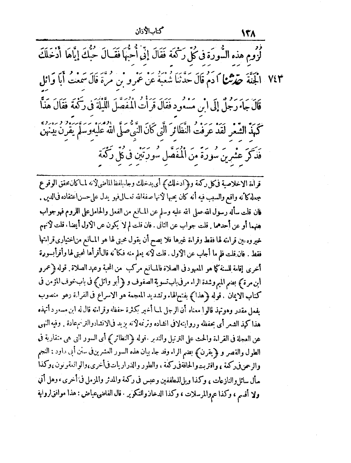 743 - حَدَّثَنَا آدَمُ قَالَ: حَدَّثَنَا شُعْبَةُ، عَنْ عَمْرِو بْنِ مُرَّةَ قَالَ: سَمِعْتُ أَبَا وَائِلٍ قَالَ جَاءَ رَجُلٌ إِلَى ابْنِ مَسْعُودٍ فَقَالَ قَرَاتُ الْمُفَصَّلَ اللَّيْلَةَ فِي رَكْعَةٍ فَقَالَ هَذًّا كَهَذِّ الشِّعْرِ لَقَدْ عَرَفْتُ النَّظَائِرَ الَّتِي كَانَ النَّبِيُّ صلى الله عليه وسلم يَقْرِنُ بَيْنَهُنَّ فَذَكَرَ عِشْرِينَ سُورَةً مِنَ الْمُفَصَّلِ سُورَتَيْنِ فِي كُلِّ رَكْعَةٍ.