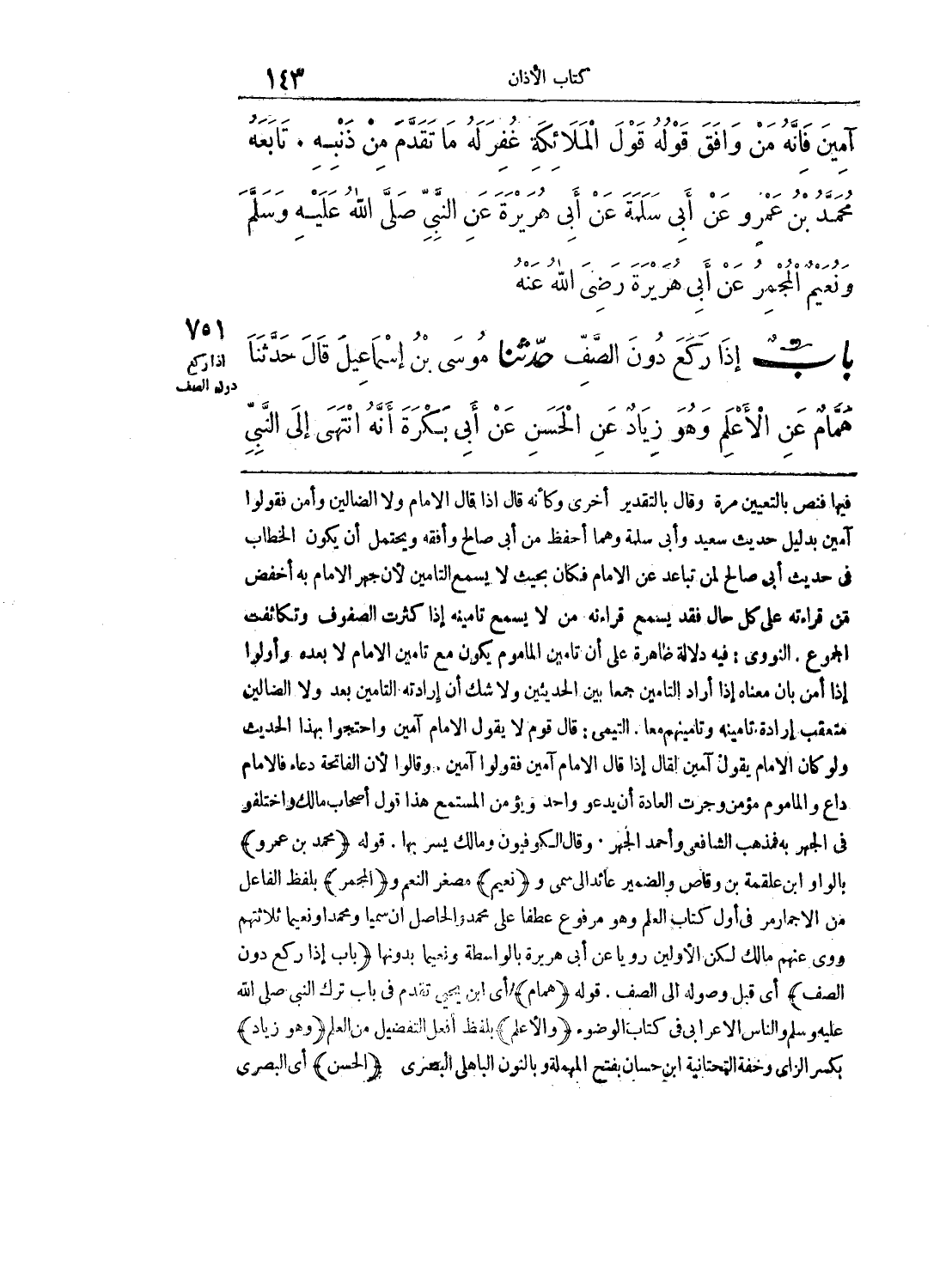 فيها فنص بالتعيين وقال بالتقدير أخرى وكأنه قال اذا قال الامام ولا الضالين وأمن فقولوا آمين بدليل حديث سعيد وأبي سلمة وهم أحفظ من أبي صالح وأفقه ويحتمل أن يكون الخطاب في حديث أبي سعيد لمن تباعد عن الامام فكان بحيث لايسمع التأمين لأن جهر الامام به أخفض من قراءته على كل حال فقد يسمع قراءته من لا يسمع تأمينه اذا كثرت الصفوف وتكاثفت الجموع. النووي: فيه دلالة ظاهرة على أن تأمين المأموم يكون مع تأمين الامام لا بعده وأولوا إذا أمن بان معناه أراد التامين جمعا بين الحديثين ولا شك أن ارادته التامين بعد ولا الضالين تعقب ارادة تامينه وتامينهم. التيمي: قال قوم لا يقوم الامام آمين واحتجوا بهذا الحديث ولو كان الامام يقول آمين لقال إذا قال الامام آمين فقولوا آمين. وقالوا لأن الفاتحة دعاء فالامام داع والمأموم مِؤمن وجرت العادة أن يدعو واحد ويؤمن المستمع هذا قول أصحاب مالك واختلفوا في الجهر به فمذهب الشافعي وأحمد الجهر. وقال الكوفيون ومالك يسر بها. قوله (محمد بن عمرو) بالواو ابن علقمة بن وقاص والضمير عائد الى سمى و (نعيم) مصغر النعم و (المجمر) بلفظ الفاعل من الاجمار مر في أول كتاب العلم وهو مرفوع عطفا على محمد ونعما ثلاثتهم روى عنهم مالك لكن الأولين رووا عن أبي هريرة بالواسطة ونعيما بدونها (باب اذا ركع بدون الصف) أي قبل وصوله الى الصف. قوله (همام) أيبن يحي تقدم ف باب ترك النبي صلى الله عله وسلم والناس الاعرابي في كتاب الوضوء (والاعلم) بلفظ أفعل التفضيل من العلم (وهو زياد) بكسر الزاي وخفة التحتانية ابن حسان بفتح المهملة وبالنون الباهلي البصري (الحسن) أي البصري