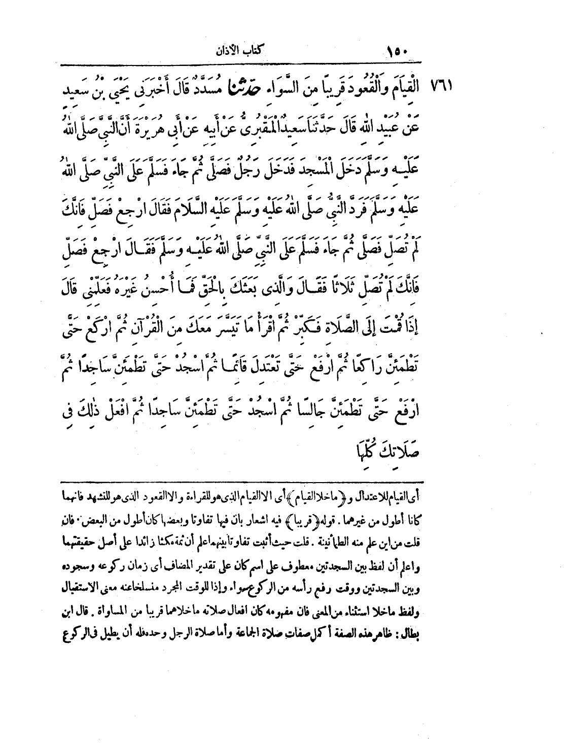761 - حَدَّثَنَا مُسَدَّدٌ قَالَ: أَخْبَرَنِي يَحْيَى بْنُ سَعِيدٍ، عَنْ عُبَيْدِ اللهِ قَالَ: حَدَّثَنَا سَعِيدٌ الْمَقْبُرِيُّ، عَنْ أَبِيهِ، عَنْ أَبِي هُرَيْرَةَ أَنَّ النَّبِيَّ صلى الله عليه وسلم دَخَلَ الْمَسْجِدَ فَدَخَلَ رَجُلٌ فَصَلَّى ثمَّ جَاءَ فَسَلَّمَ عَلَى النَّبِيِّ صلى الله عليه وسلم فَرَدَّ النَّبِيُّ صلى الله عليه وسلم عَلَيْهِ السَّلاَمَ فَقَالَ ارْجِعْ فَصَلِّ فَإِنَّكَ لَمْ تُصَلِّ فَصَلَّى ثُمَّ جَاءَ فَسَلَّمَ عَلَى النَّبِيِّ صلى الله عليه وسلم فَقَالَ ارْجِعْ فَصَلِّ فَإِنَّكَ لَمْ تُصَلِّ ثَلاَثًا فَقَالَ وَالَّذِي بَعَثَكَ بِالْحَقِّ فَمَا أُحْسِنُ غَيْرَهُ فَعَلِّمْنِي قَالَ إِذَا قُمْتَ إِلَى الصَّلاَةِ فَكَبِّرْ ثُمَّ اقْرَا مَا تَيَسَّرَ مَعَكَ مِنَ الْقُرْآنِ ثُمَّ ارْكَعْ حَتَّى تَطْمَئِنَّ رَاكِعًا ثُمَّ ارْفَعْ حَتَّى تَعْتَدِلَ قَائِمًا ثُمَّ اسْجُدْ حَتَّى تَطْمَئِنَّ سَاجِدًا ثمَّ ارْفَعْ حَتَّى تَطْمَئِنَّ جَالِسًا ثُمَّ اسْجُدْ حَتَّى تَطْمَئِنَّ سَاجِدًا ثُمَّ افْعَلْ ذَلِكَ فِي صَلاَتِكَ كُلِّهَا.