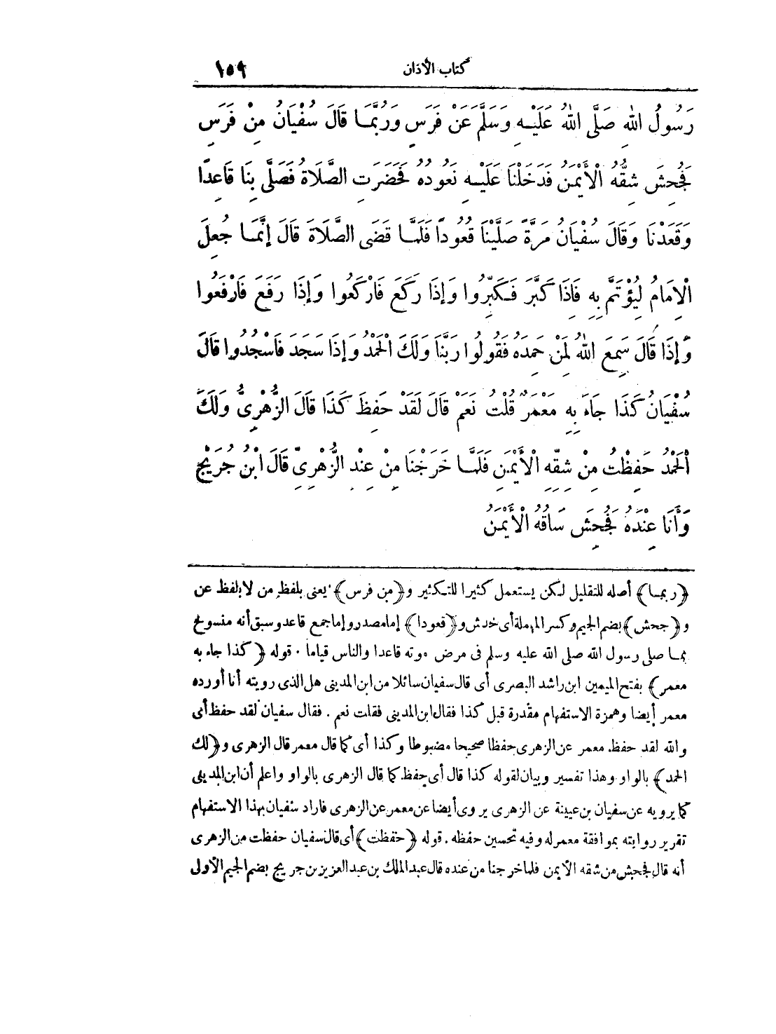 (ربما) أصله للتقليل لكن يستعمل كثيرا للتكثير و (من فرس) يعني بلفظ من لا بلفظ عن و (جحش) بضم الجيم وكسر المهملة أي خدش و (قعودا) إما مصدر وإما جمع قاعد وسبق أنه منسوخ بما صلى رسول الله صلى الله عليه وسلم في مرض. موته قاعدا والناس قياما. قوله (كذا جاء به معمر) بفتح اليمين ابن راشد البصري أي قال سفيان سائلا من ابن المديني هل الذي رويته أنا أورده معمر أيضا وهمزة الاستفهام مقدرة قبل كذا فقال ابن المديني فقلت نعم. فقال سفيان لقد حفظ أبي والله قد حفظ. معمر عن الزهري حفظا صحيحا مضبوطا وكذا أي كما قال معمر قال الزهري و (لك الحمد) بالواو وهذا تفسير وبيان لقوله كذا قال أي حفظ كما قال الزهري بالواو واعلم أن ابن المديني كما يرويه عن سفيان بن عيينة عن الزهري يروي أيضا عن معمر عن الزهري فأراد سفيان بهذا الاستفهام تقرير روايته بموافقة معمر له وفيه تحسين حفظه. قوله (حفظت) أي قال سفيان حفظت من الزهري أنه قال فجحش من شقه الأيمن فلما خر جنا من عنده قال عبد الملك بن عبد العزيز بن جريج بضم الجيم الأولى